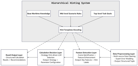 Data preprocessing layer: Cleans, standardizes, and aligns multi-source non-uniform sampling data (radar, AIS). Guided by underlying navigation knowledge, it converts raw data into structured formats (e.g., “timestamp-sampling interval-observation-maneuver tag” quadruples) and filters noise using expert-summarized sensor error characteristics (e.g., “radar range error rises with detection range”) to ensure data quality.