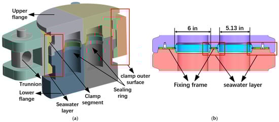 Connector structure and heat transfer model, including (a) overall structure of the connector, the seawater layer between the clamp and flange, and the outer surface of the clamp; (b) seawater layer between sealing ring and fixing frame.