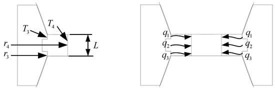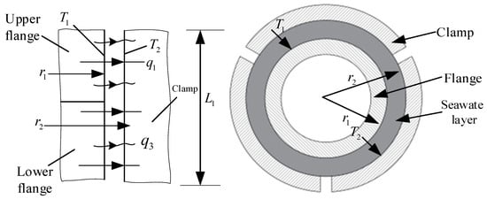 Figure 2 displays the two-dimensional view of the connection between the clamp and flange after preloading. The heat transfer methods between the flange and clamp segment include three types: thermal conduction , convective heat transfer and thermal radiation [2,16]. Since the flow velocity of seawater between the clamp segment and the flange is extremely low, convective heat transfer can be neglected, and only thermal conduction and thermal radiation are considered [17]. However, neither the inner surface of the clamp segment nor the outer surface of the flange is a flat surface, which may cause other surfaces to interfere with energy exchange. To accurately describe the energy transfer efficiency between the two surfaces, the view factor is introduced; the value of the view factor mainly depends on the geometric state of the two heat transfer surfaces, and it only represents the percentage of energy transfer between the two surfaces, without involving the energy absorption capacity of the surfaces. For the heat transfer model between the flange and the clamp, it is simplified to the heat transfer problem between two concentric cylinders, and the view factor is expressed as follows: