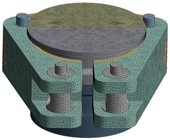 To verify that the underwater dual-hole connector can maintain an effective seal under the temperature field analyzed previously, an axial displacement was first applied as the initial load based on the prior heat transfer model to achieve a preloaded state [19,20]. Then, internal pressure and end loads were applied to the dual holes inside the connector to simulate the actual conditions when oil and gas are introduced. In addition, the “body load” corresponding to the temperature of each node of the underwater dual-hole connector obtained from the temperature field analysis was converted into a static load, which was then applied to the components together with the pressure and preload force, thereby obtaining the thermal–structural coupled stress state of the underwater dual-hole connector [21,22]. Thermal expansion coefficients of subsea dual-channel connector materials is shown in Table 2.