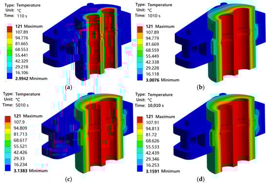 Transient temperature field contour of the subsea dual-channel connector under the uniform heating condition: (a) 100 s; (b) 1000 s; (c) 5000 s; (d) 10,000 s. The diagram shows a half-sectional view.