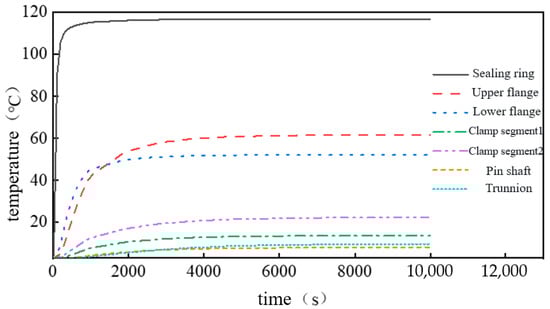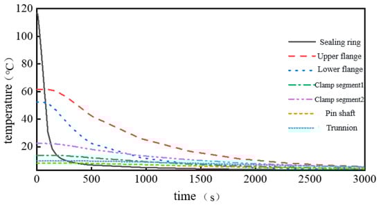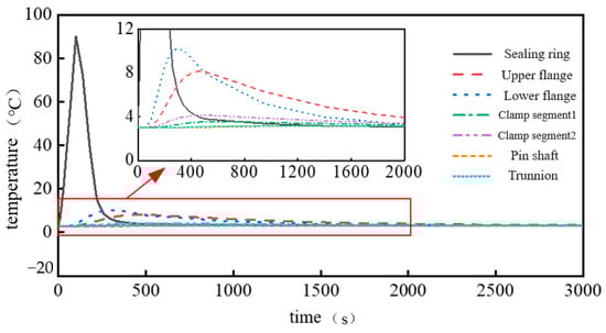 As shown in Figure 11, the temperature of the sealing ring reaches its peak at 100 s, then starts to drop, and stabilizes after 500 s; the temperature of the reference points on the upper and lower flanges reaches the peak at 400 s, and stabilizes after 2000 s; the temperature of the pins and trunnions reaches the peak at 500 s, and stabilizes after 2000 s.