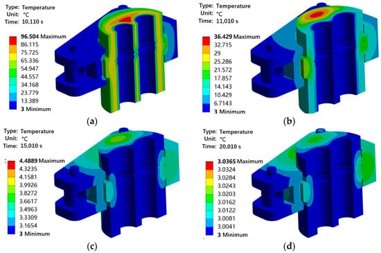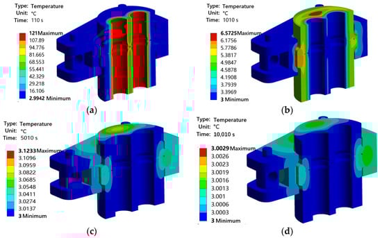 Transient temperature field contour of the subsea dual-channel connector under the uniform cooling condition: (a) 100 s; (b) 1000 s; (c) 5000 s; (d) 10,000 s. The diagram shows a half-sectional view.