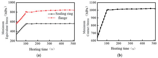Variation in stress and contact stress under temperature rising and pressure rising condition: (a) equivalent stress of the sealing ring and flange; (b) contact stress of the sealing ring.