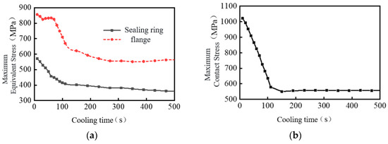 Figure 14 shows the coupling stress analysis results under different temperature drop and pressure reduction times. The period from 0 to 100 s is the temperature drop and pressure reduction stage. During 100 s, the internal pressure of the subsea dual-channel connector drops from 69 MPa to 0 MPa, and the inner wall temperature drops from 121 °C to 3 °C. Within 0–100 s, the equivalent stress and contact stress of the sealing ring and flange decrease rapidly; when the temperature drops to 3 °C, the maximum equivalent stress of the sealing ring is 669.28 MPa (located at the contact position between the flange and the sealing ring), the maximum contact stress is 578.42 MPa, and the flange stress is 558.71 MPa, all of which are much higher than those in the preload state (100–500 s). During the period from 100 s to 500 s, the maximum equivalent stress and contact stress of the sealing ring and flange continue to decrease, but the rate of reduction gradually decreases. This is because the temperature difference between the inside and outside of the sealing ring gradually decreases at this time, leading to a reduction in the stress change rate. When the temperature drops to 500 s, the maximum equivalent stress of the sealing ring is 562.79 MPa (still greater than that in the preload state), and the contact stress is 555.98 MPa (lower than that in the preload state). This is due to the plastic deformation occurring on the surface of the sealing ring, which cannot fully recover its initial shape after the load disappears. For the connector as a whole, although the sealing ring undergoes plastic deformation, the contact stress analysis indicates that it still meets the sealing requirements.