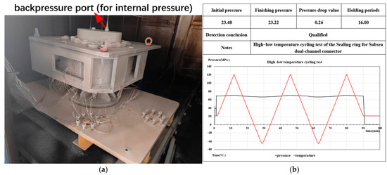 This test was conducted in a high–low temperature cycling chamber to verify the sealing performance of the underwater connector under high and low temperature conditions. The procedure strictly followed the requirements for high–low temperature cycling tests specified in Appendix F1.11.3 of the API 6A (2018 edition) [25] standard, focusing on the connector’s sealing reliability under pressure within the temperature range of −46 °C to 121 °C.