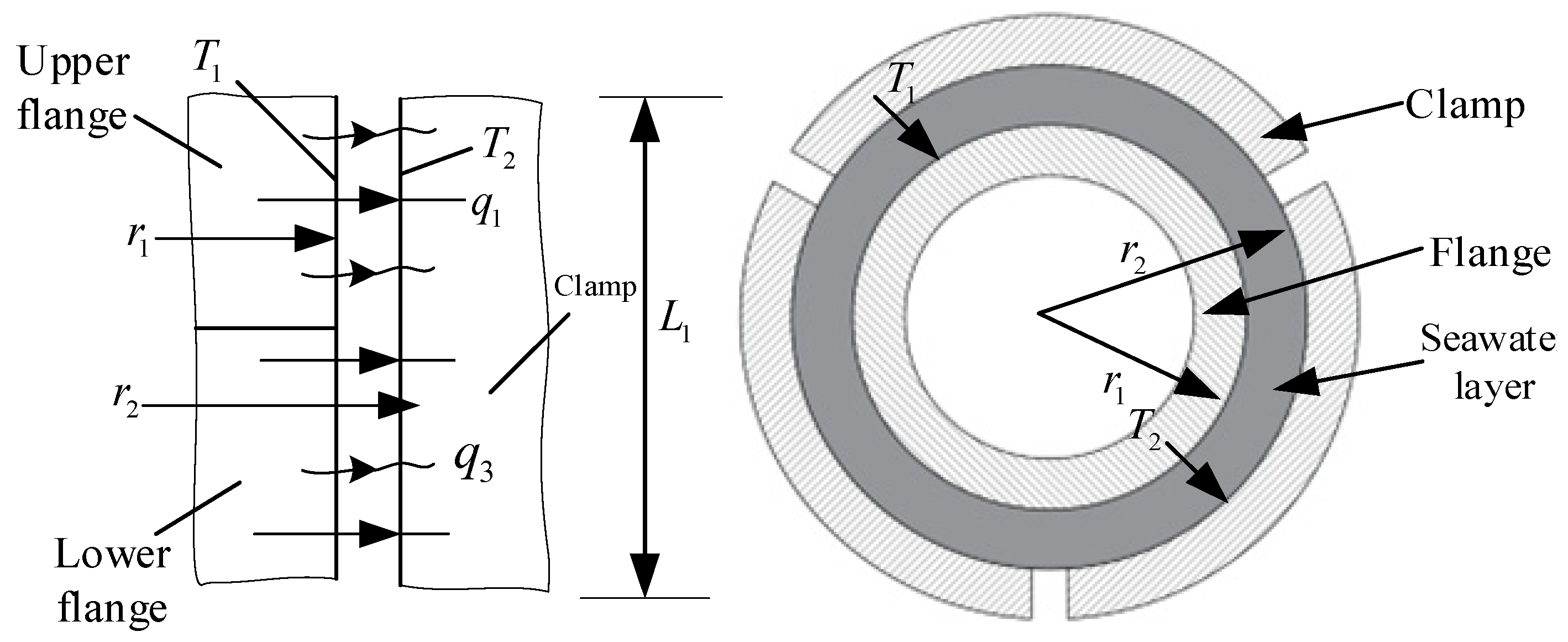 16]. Since the flow velocity of seawater between the clamp segment and the flange is extremely low, convective heat transfer can be neglected, and only thermal conduction and thermal radiation are considered [