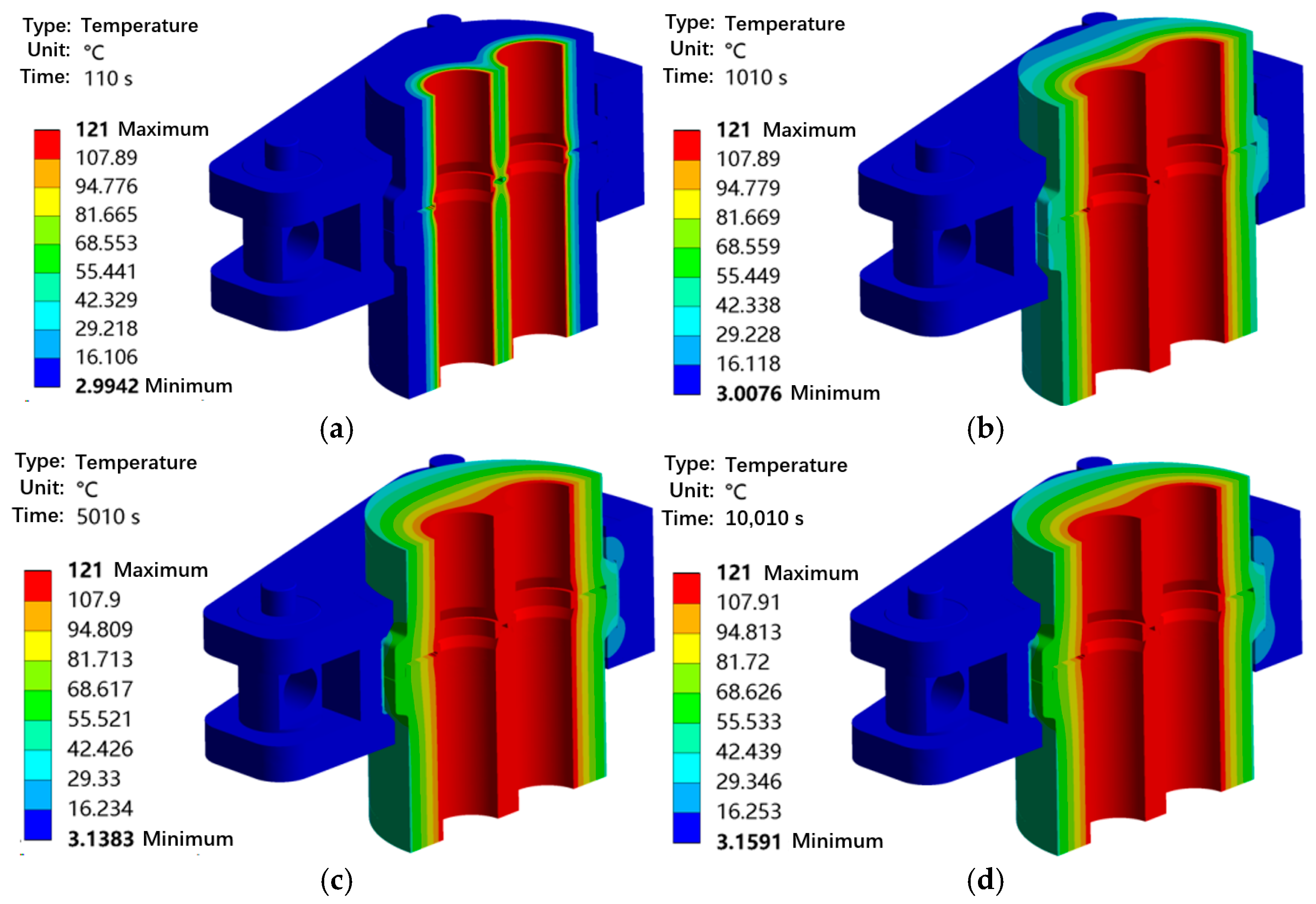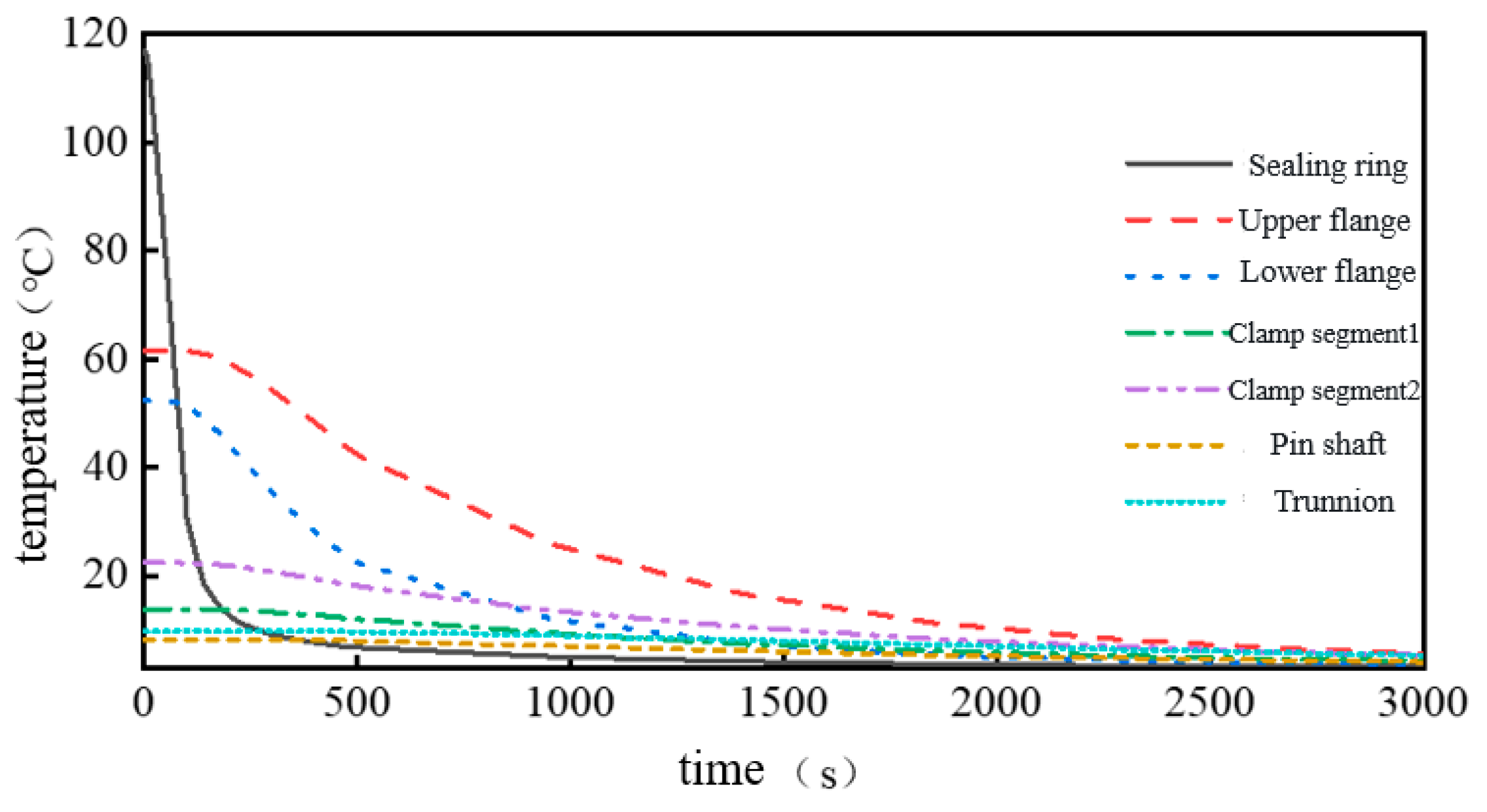 24]. The application methods of node temperature and static force are consistent with those in the steady-state simulation. First, the simulation results of the subsea dual-channel connector under preload conditions are solved, then the temperature and pressure load under different working conditions are applied in sequence, and finally the variation law of its sealing performance under the action of transient temperature field and pressure is analyzed.