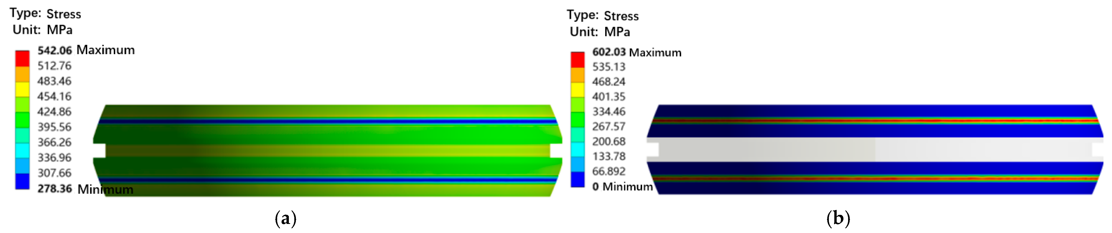 Figure 12. It can be seen from the figure that the maximum equivalent stress of the metal sealing ring is 542.06 MPa, which is located at its groove; the stress distribution of the two sealing rings is uniform and basically consistent; the maximum equivalent stresses of the upper and lower flanges are 316.54 MPa and 291.44 MPa, respectively; the maximum contact stress of the sealing ring is 602.03 MPa. The thermal–structural coupling analysis in this section adopts solid models. To reduce the amount of calculation, only the upper and lower flanges and sealing rings are subjected to thermal–structural coupling simulation analysis.