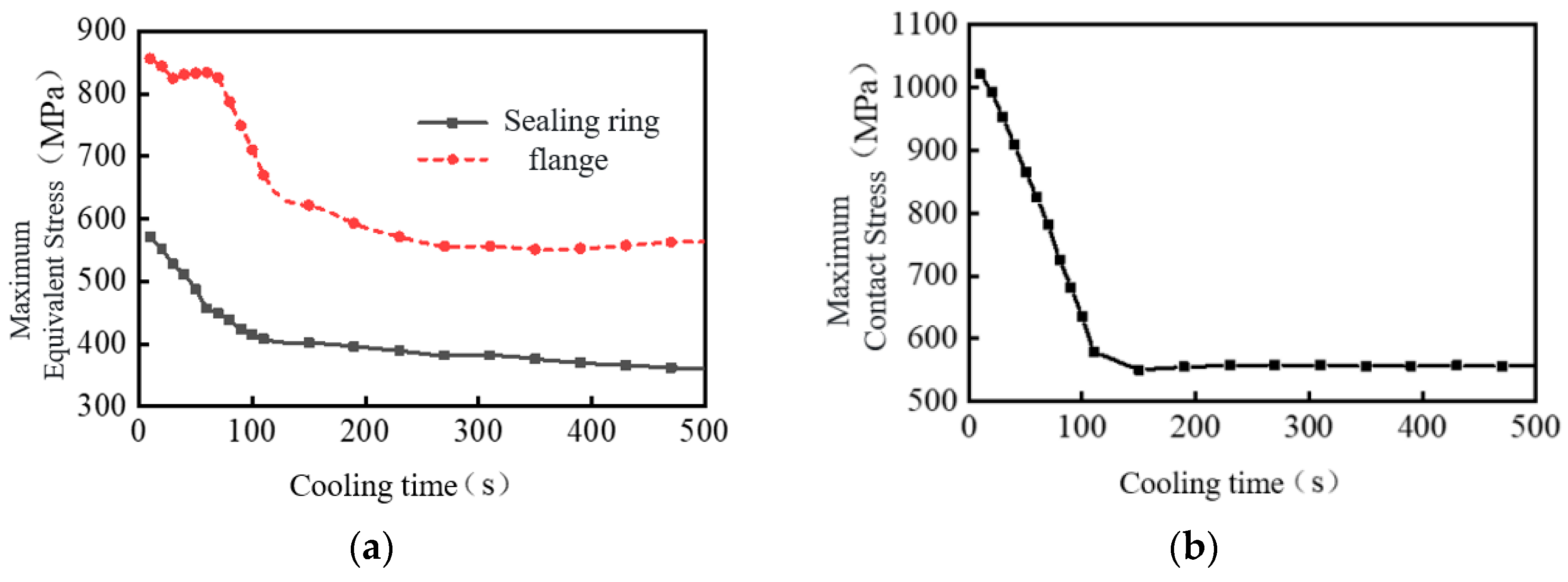 Figure 14 shows the coupling stress analysis results under different temperature drop and pressure reduction times. The period from 0 to 100 s is the temperature drop and pressure reduction stage. During 100 s, the internal pressure of the subsea dual-channel connector drops from 69 MPa to 0 MPa, and the inner wall temperature drops from 121 °C to 3 °C. Within 0–100 s, the equivalent stress and contact stress of the sealing ring and flange decrease rapidly; when the temperature drops to 3 °C, the maximum equivalent stress of the sealing ring is 669.28 MPa (located at the contact position between the flange and the sealing ring), the maximum contact stress is 578.42 MPa, and the flange stress is 558.71 MPa, all of which are much higher than those in the preload state (100–500 s). During the period from 100 s to 500 s, the maximum equivalent stress and contact stress of the sealing ring and flange continue to decrease, but the rate of reduction gradually decreases. This is because the temperature difference between the inside and outside of the sealing ring gradually decreases at this time, leading to a reduction in the stress change rate. When the temperature drops to 500 s, the maximum equivalent stress of the sealing ring is 562.79 MPa (still greater than that in the preload state), and the contact stress is 555.98 MPa (lower than that in the preload state). This is due to the plastic deformation occurring on the surface of the sealing ring, which cannot fully recover its initial shape after the load disappears. For the connector as a whole, although the sealing ring undergoes plastic deformation, the contact stress analysis indicates that it still meets the sealing requirements.