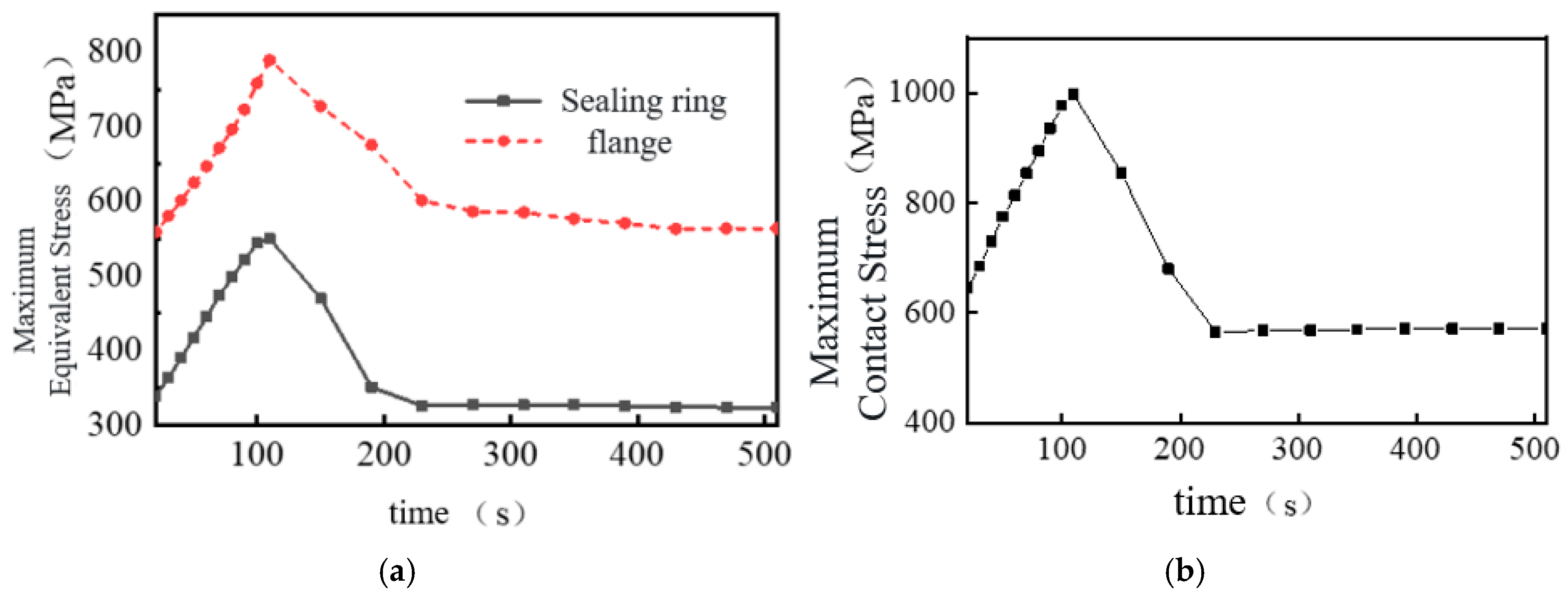 Figure 13 that the period from 0 to 10 s is the preload state, and the period from 10 to 110 s is the temperature and pressure rise stage. During 100 s, the internal pressure of the subsea dual-channel connector rises from 0 to 69 MPa, and the inner wall temperature rises from 3 °C to 121 °C. During this stage, the maximum equivalent stress of the sealing ring gradually increases; when the temperature rises to 121 °C, the maximum equivalent stress of the metal sealing ring is 801.07 MPa (which is less than the yield strength of Inconel 718 material), and it is located at the contact position between the flange and the sealing ring, with the maximum contact stress being 1006.7 MPa. Compared with the preload state, under the action of temperature and pressure, the maximum stress of the sealing ring increases by approximately 200 MPa, the maximum contact stress increases by approximately 404 MPa, and the flange stress is 558.71 MPa (which is higher than that in the preload state). This is because during heating and pressurization, the temperature difference of the sealing ring gradually increases, and it expands outward under the combined action of temperature and pressure, resulting in further compression between the sealing ring and the flange, and thus a rapid increase in stress. Additionally, the constraints at both ends of the flange in the simulation lead to a certain degree of overestimation of the results 110–510 s. During the period from 110 s to 510 s, the maximum equivalent stress and contact stress of the sealing ring and flange continue to increase, but the growth rate decreases and gradually flattens out. This is because the temperature difference between the inside and outside of the sealing ring gradually decreases to a stable state at this time, resulting in a reduction in the stress growth rate. In summary, although the subsea dual-channel connector is significantly affected by temperature and pressure, it can still meet the sealing requirements.