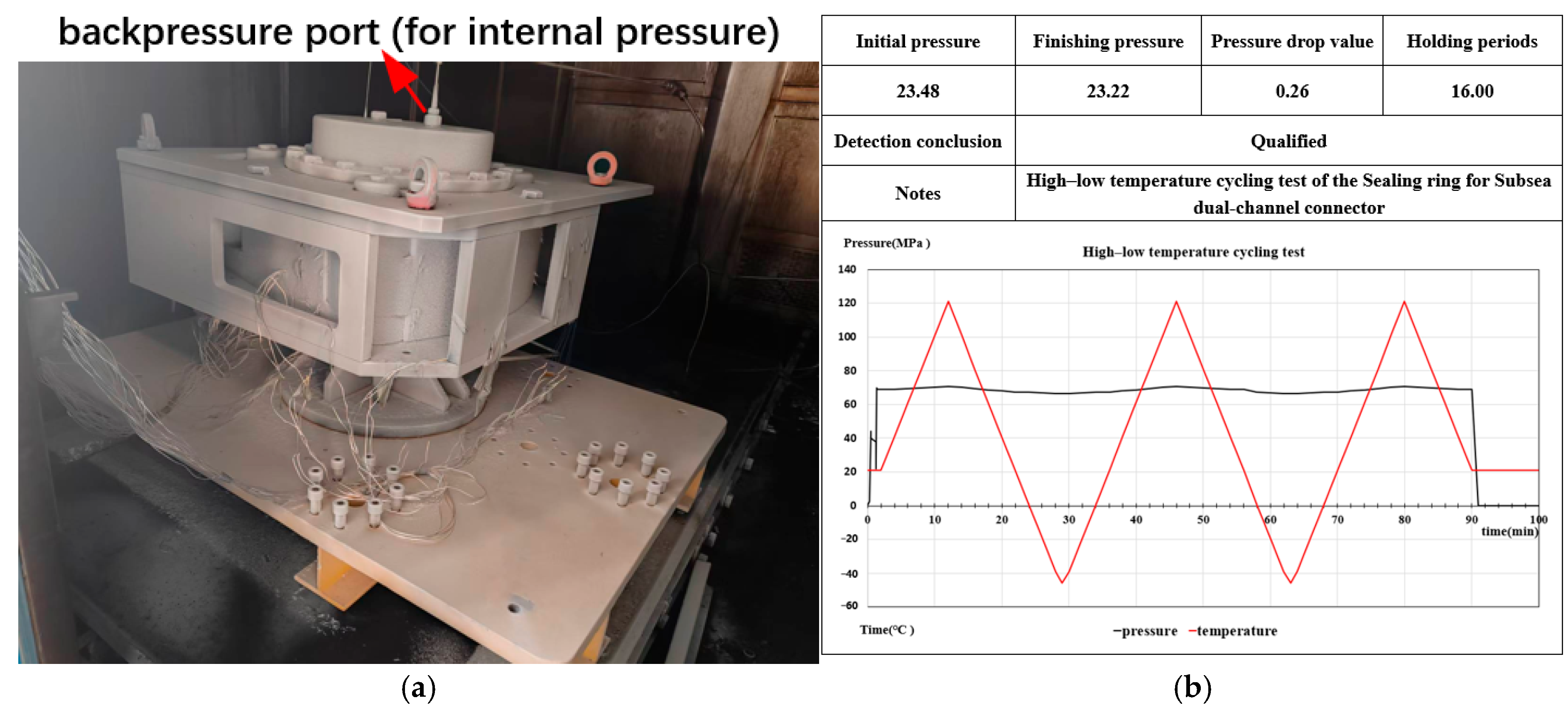 This test was conducted in a high–low temperature cycling chamber to verify the sealing performance of the underwater connector under high and low temperature conditions. The procedure strictly followed the requirements for high–low temperature cycling tests specified in Appendix F1.11.3 of the API 6A (2018 edition) [