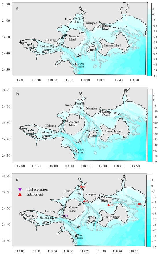 Bathymetry evolution and observation stations in Xiamen Bay. (a) 1985; (b) 2003; (c) 2021.
