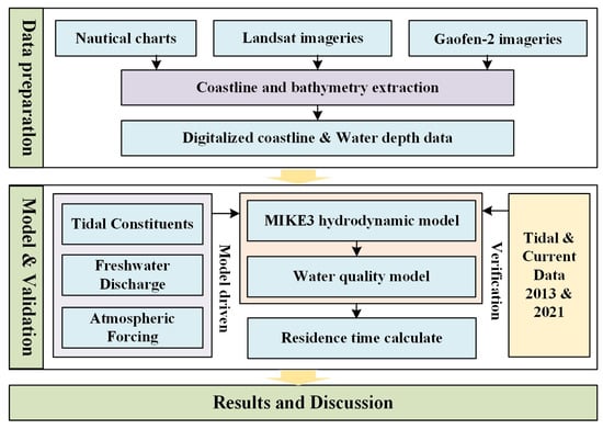 This study employs remote sensing interpretation and numerical modeling to systematically analyze the long-term evolution of the hydrodynamic environment in XMB. Multi-temporal satellite images and historical nautical charts were digitized to extract shoreline variation and water depth data. A three-dimensional coupled hydrodynamics-water quality model was then established for XMB and validated using tidal current and water level measurements. Multiple numerical scenarios were designed to simulate the spatio-temporal variations in water residence time across different historical periods. Finally, the patterns and driving factors of these changes were comprehensively analyzed, and policy recommendations oriented toward ecological protection and sustainable management were proposed, providing a scientific basis for coastal restoration and integrated management. The methodological framework is illustrated in Figure 2.