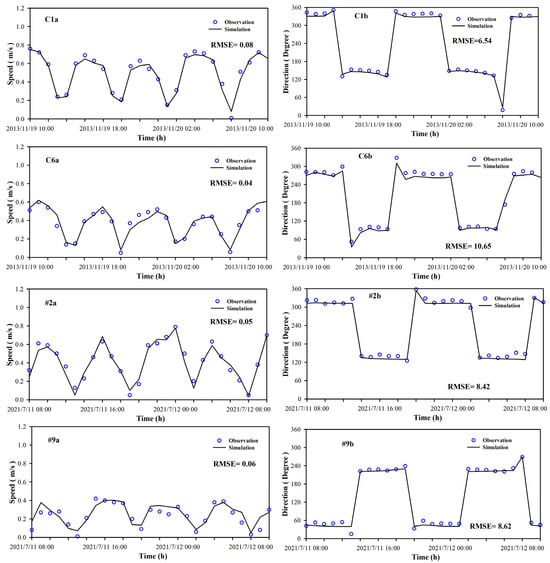 The model validation was conducted using field measurements of tidal levels and current velocities collected from multiple stations within the XMB area. The locations of these observational stations are illustrated Figure 1. Within the model domain, one tidal gauge station was utilized, and data from two periods, 16 November to 16 December 2013 and 5 July to 4 August 2021—were selected for comparison. Current measurements were carried out using a 1200 kHz Acoustic Doppler Current Profiler (ADCP) mounted downward on a vessel, with each deployment lasting 27 h. At stations C1 and C6, measurements were conducted from 19 to 20 November 2013. At stations #2 and #9, the measurements took place from 11 to 12 July 2021. Figure 3 illustrates the verification curves comparing simulated and observed tidal elevations at the Heping port (T1) tide gauge station in 2013 and 2021 of Xiamen. Model performance was quantified using the root mean square error (RMSE), which indicated a remarkable correlation between the numerical solutions and in situ measures. The comparison between the simulated and the observed tidal level revealed strong consistency, with RMSE values of 0.10 m at station T1 in 2013 and 0.12 m in 2021. These results confirm the model’s capability to accurately replicate tidal dynamics in XMB. As shown in Figure 4, the simulated flow velocity and direction align closely with field measurements. The RMSE values for flow velocity ranged from 0.04 m/s to 0.08 m/s, while directional errors fell within 6.54° to 10.65°, demonstration close agreement between model predictions and field observations. The simulation results show strong agreement with measured values at observations stations. The flow patterns of all stations show obvious linear current, demonstrating that the model successfully captures the hydrodynamic field of XMB and demonstrates potential for further application on water quality model. However, this verification is based on a limited number of stations and a specific hydrological period. Further analysis of long-term impacts and seasonal variations requires more comprehensive data.