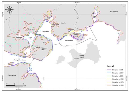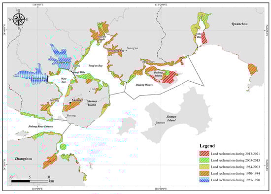 Since the 1950s, the coastline of XMB has undergone considerable alterations due to various land reclamation projects. The cumulative area reclaimed in XMB reached 188.08 km2 during 1955–2021 (Table 1). Figure 5 illustrates the significant modifications to the coastline resulting from extensive land reclamation efforts undertaken between 1955 and 2021 in XMB. Additionally, Figure 6 presents a schematic representation of the reclamation activities in XMB at various intervals from 1955 to 2021. The reclaimed areas were derived from the analysis of the satellite images and historical nautical chart data. The historical progression of coastal development and reclamation in XMB can be categorized into three distinct phases.