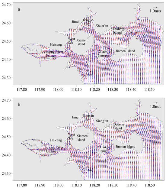 Simulated flow fields at flood tide (red arrow) and ebb tide (blue arrow) in the XMB. (a) Surface field in 2021; (b) Bottom field in 2021.