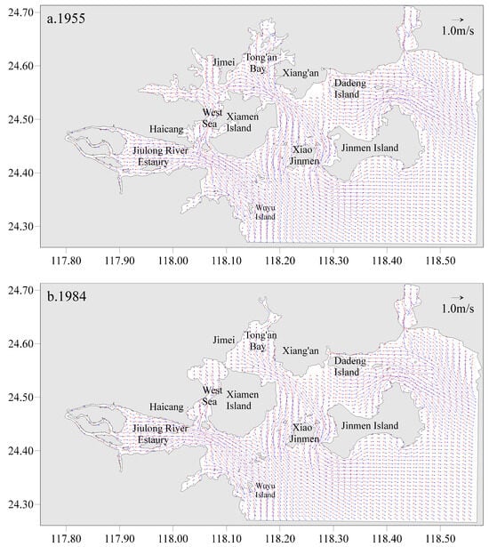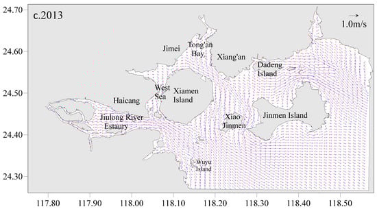 Simulated depth-average hydrodynamics fields at flood tide (red arrow) and ebb tide (blue arrow) in the XMB. (a) 1955; (b) 1984; (c) 2013.