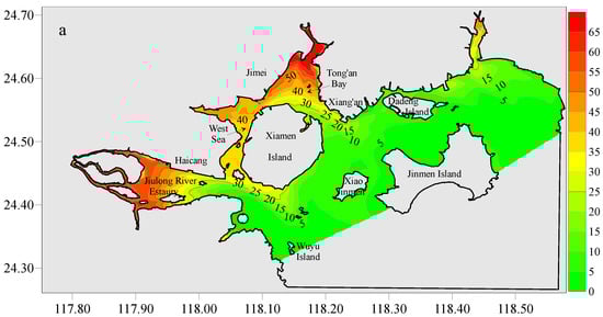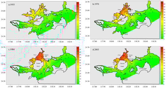 In 1955, the shoreline of XMB was primarily characterized by its natural state (Figure 9a), featuring an expansive water area, significant tidal volume, strong internal connectivity within the bay, vigorous hydrodynamic forces, and a high rate of water exchange between the bay and the adjacent open sea. This dynamic resulted in generally low residence times for water within the bay. In contrast, the regions surrounding Xinglin Bay, Maluan Bay, and the upper sections of Tong’an Bay exhibited relatively extended water residence times, indicating weaker hydrodynamic forces in these areas. This condition led to prolonged water exchange durations, thereby facilitating the accumulation of pollutants. Specifically, the average residence time in the West Sea varied between 20 and 46 days, while in Tong’an Bay, it ranged from 13 to 49 days, and in the Jiulong River estuary, it was between 2 and 24 days. The shortest residence time was recorded in the Dadeng Sea, with a range of 1 to 26 days.