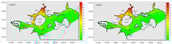 Throughout the research period, the average residence time in XMB initially increased before subsequently declining. From 1955 to 2003, the ongoing implementation of reclamation projects led to a reduction in XMB, resulting in decreased water exchange and a gradual increase in residence time from 13.28 days to 16.94 days. Subsequently, the initiation of ecological restoration projects, including the opening of the seawall and dredging activities, improved the water exchange capacity of XMB, leading to a reduction in residence time to 15.23 days in 2013 and 16.12 days in 2021. The hydrodynamic conditions in the West Sea and Tong’an Bay have been restored to levels comparable to those observed along the shoreline in 1970. These findings align with the results reported by Wang et al. [].