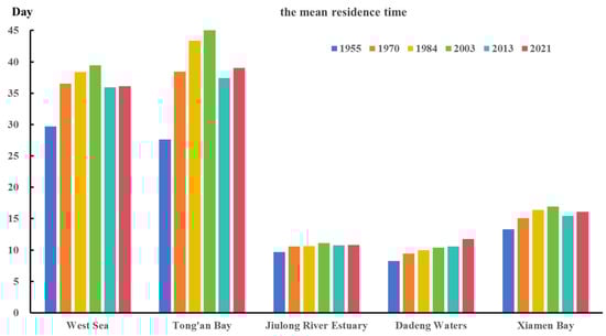 Utilizing simulation outcomes derived from various shoreline conditions, the average residence times for each year in the West Sea, Tong’an Bay, Jiulong River Estuary, and Dadeng Waters were calculated to elucidate the patterns of water exchange characteristics in XMB. The findings were presented in Table 3 and Figure 10.