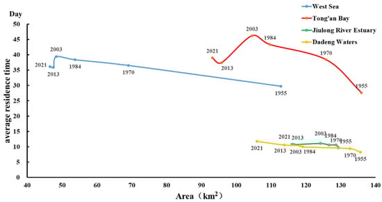 Tidal currents serve as the primary drivers of alterations in the aquatic environment within coastal regions, while hydrodynamic conditions are closely linked to bays area. Reclamation initiatives along the XMB have altered tidal currents, consequently influencing the water exchange capacity. Figure 11 illustrates the relationship between bay area and average residence time. The calculation results show that the average residence in XMB over the past 70 years presents a typical negative correlation with the bay area. This trend is especially pronounced in the West Sea and Tong’an Bay, where continuous land reclamation have progressively advanced the coastline seaward, reducing bay area and increasing residence time. These findings aligh with those reported by Xu et al. [] and Sun et al. [], confirming that shoreline modification reduces bay area and consequently diminish water exchange capability.