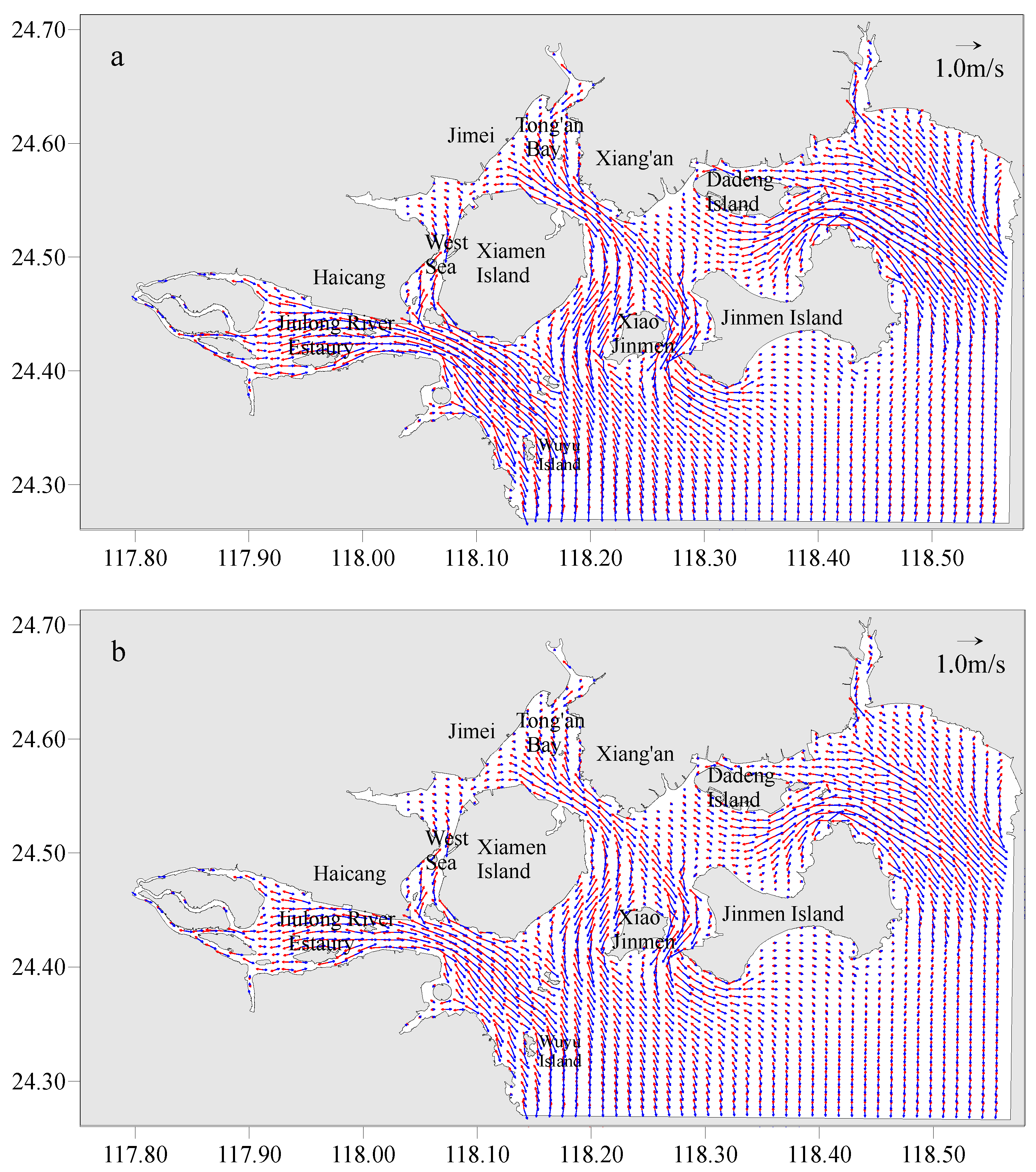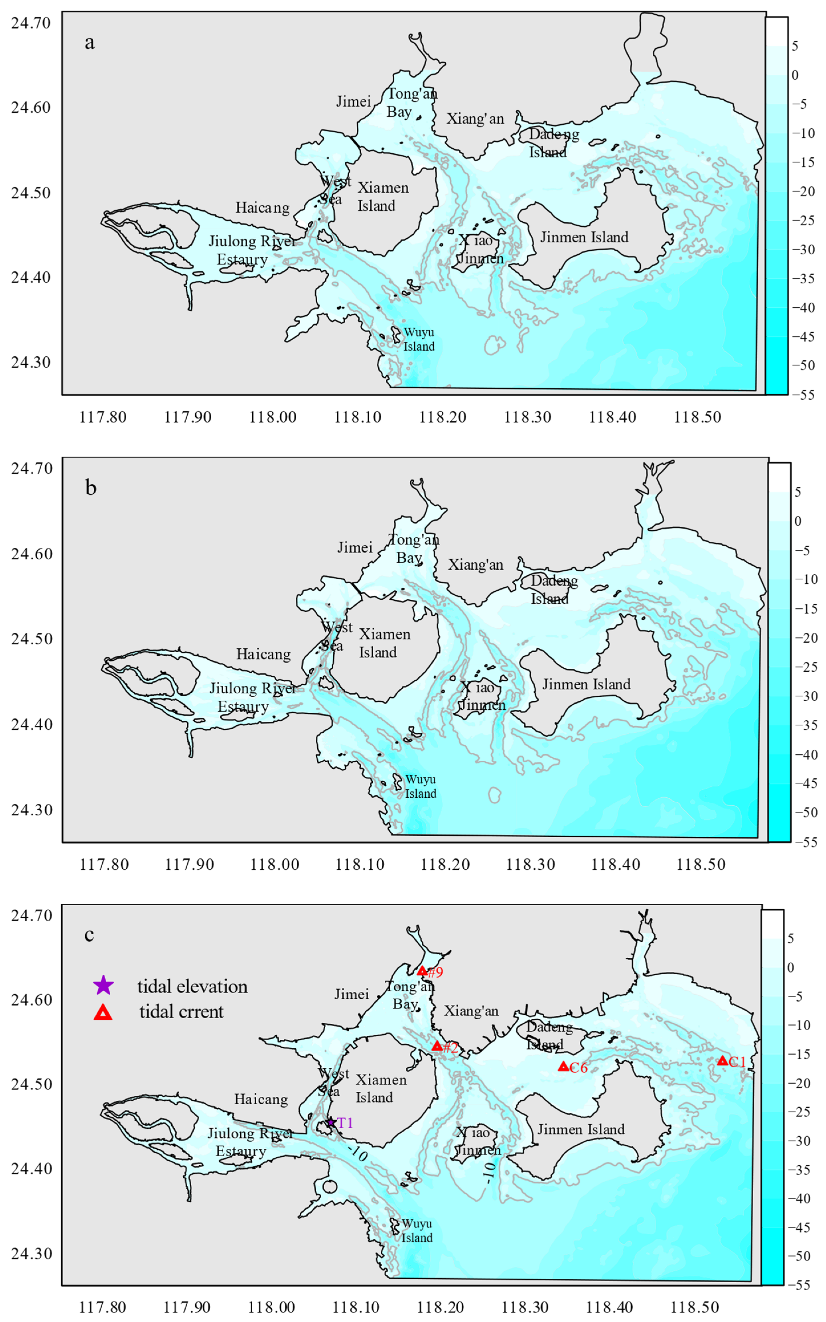Figure 1). The bay comprises several distinct regions, including the Jiulong River Estuary, the West Sea, Tong’an Bay, Dadeng Waters, etc. Hydrodynamically, XMB is characterized by a regular semidiurnal tidal regime, with an average tidal range of 3.99 m. Tidal dynamics dominate the hydrodynamic field of this region [