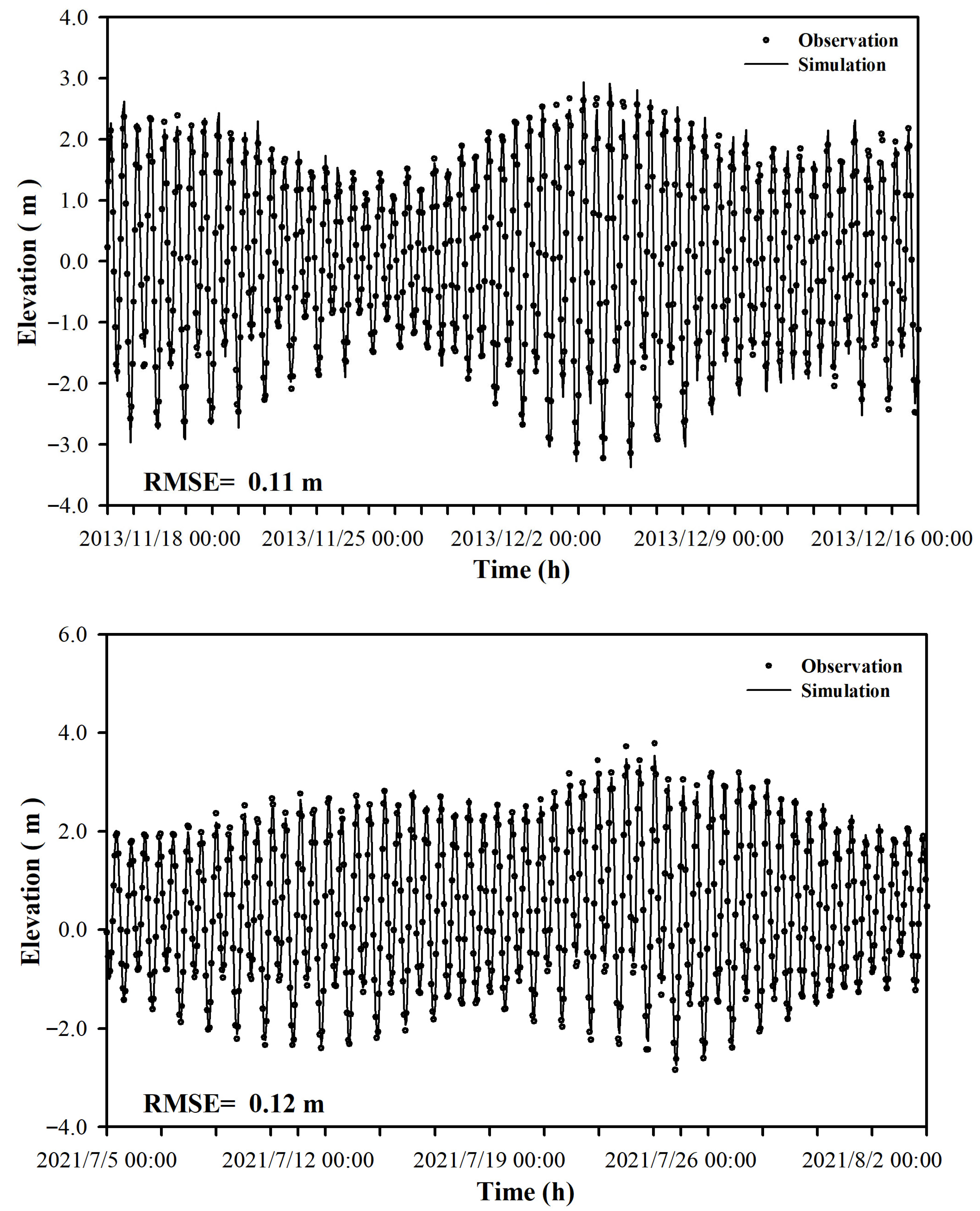 Figure 7 shows the surface and bottom flow fields diagrams at flood tide and ebb tide in 2021 of the XMB. Tidal currents enter through the open boundaries and bifurcate into two branches: one originating from the north and the other from the south. As the southern branch traverses west of Jinmen Island, it splits two streams: one stream flows northwest towards the Jiulong River Estuary and the West Sea, while the other stream flows northeast along the Jinmen waterway and the eastern waterway of XMB. These two streams subsequently converge with the northern branch from Weitou in the maritime area southwest of Dadeng Island at the entrance of Tong’an Bay before continuing northward into Tong’an Bay. During ebb tide, the current reverses directions and flows seaward to the landward movement observed during flood tide. Simulation results indicate that the current speed in the strong current areas typically reaches 1.0 m/s. The tidal currents within the bay are predominantly influenced by the topography, exhibiting a reciprocating flow pattern. The waterways between the eastern and western maritime areas of Xiamen Island and Jinmen Waterway all demonstrate a reciprocating flow pattern aligned with the orientation of the waterways. Specifically, the flood tide flows towards the northwest or north, while the ebb tide flows towards the southeast or south. By comparing with the surface flow field, as the water depth increases and the water area decreases, the bottom flow velocity will decrease, but the flow field structure is basically consistent with that of the surface.