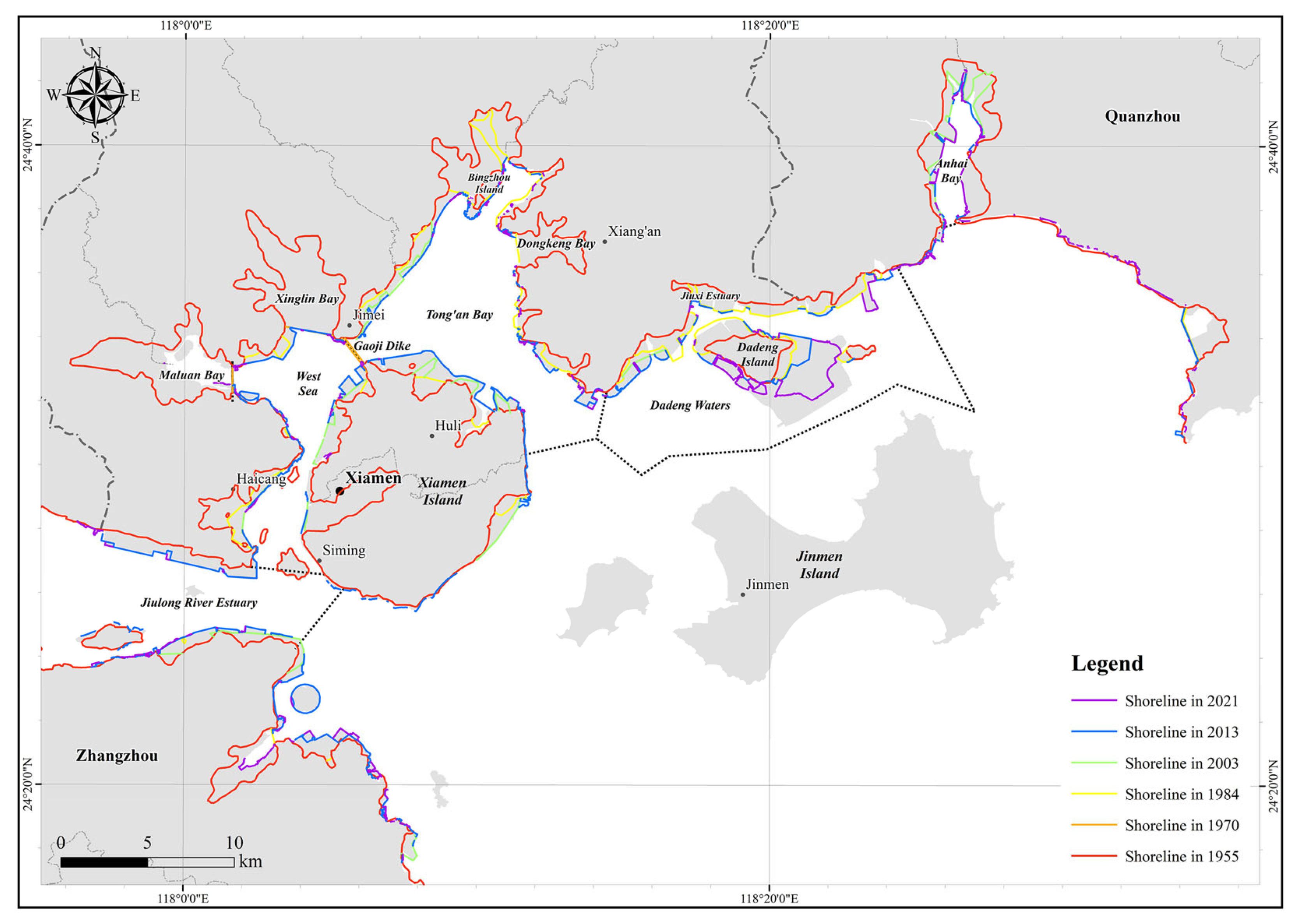 38]. This phase also saw the establishment of embankments that obstructed Maluan Bay, Xinglin Bay, and Dongkeng Bay, primarily for aquaculture and urban development purposes [