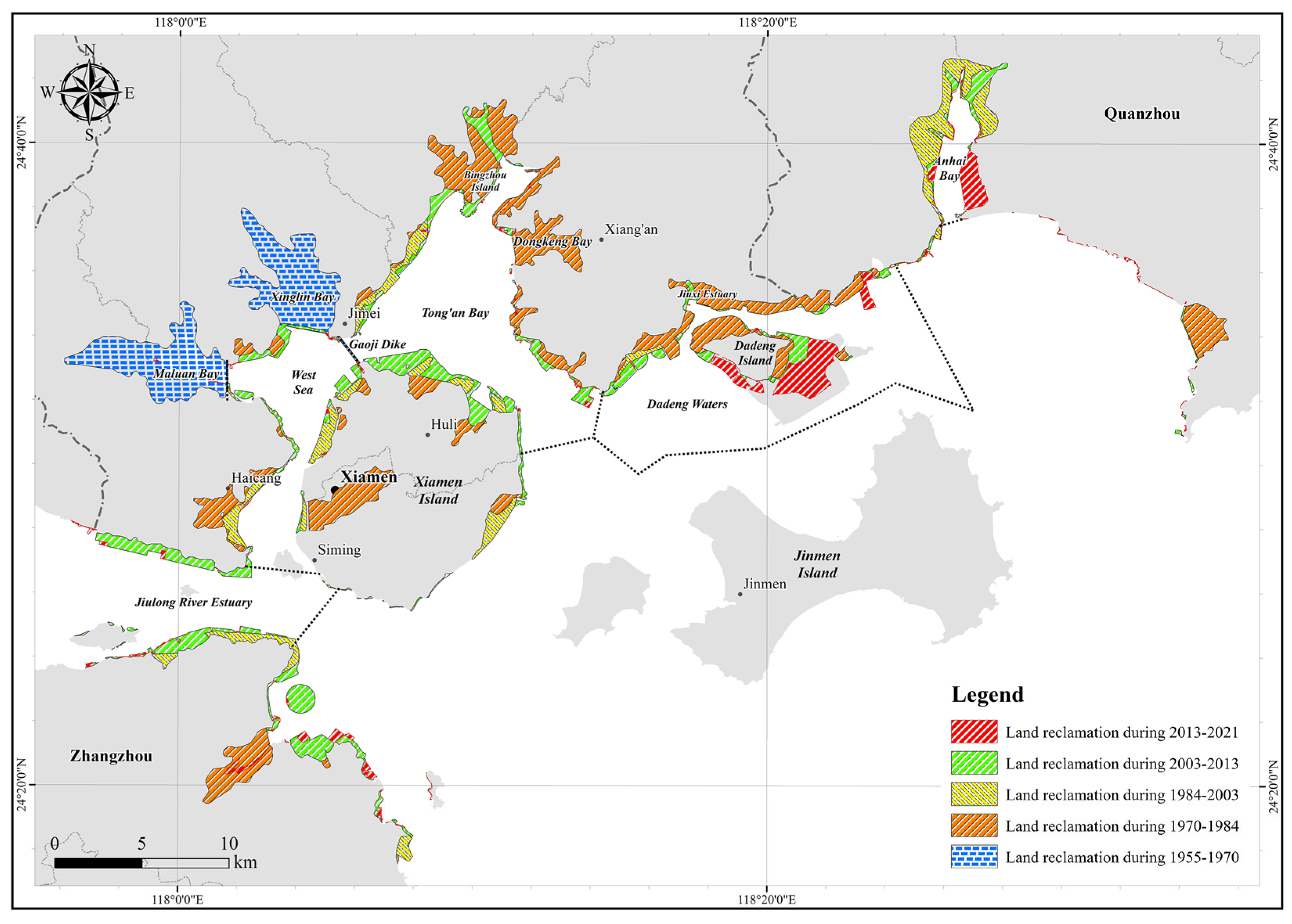 In terms of spatial distribution, the reclamation projects of XMB are predominantly located in the West Sea, Tong’an Bay and Dadeng Waters (
