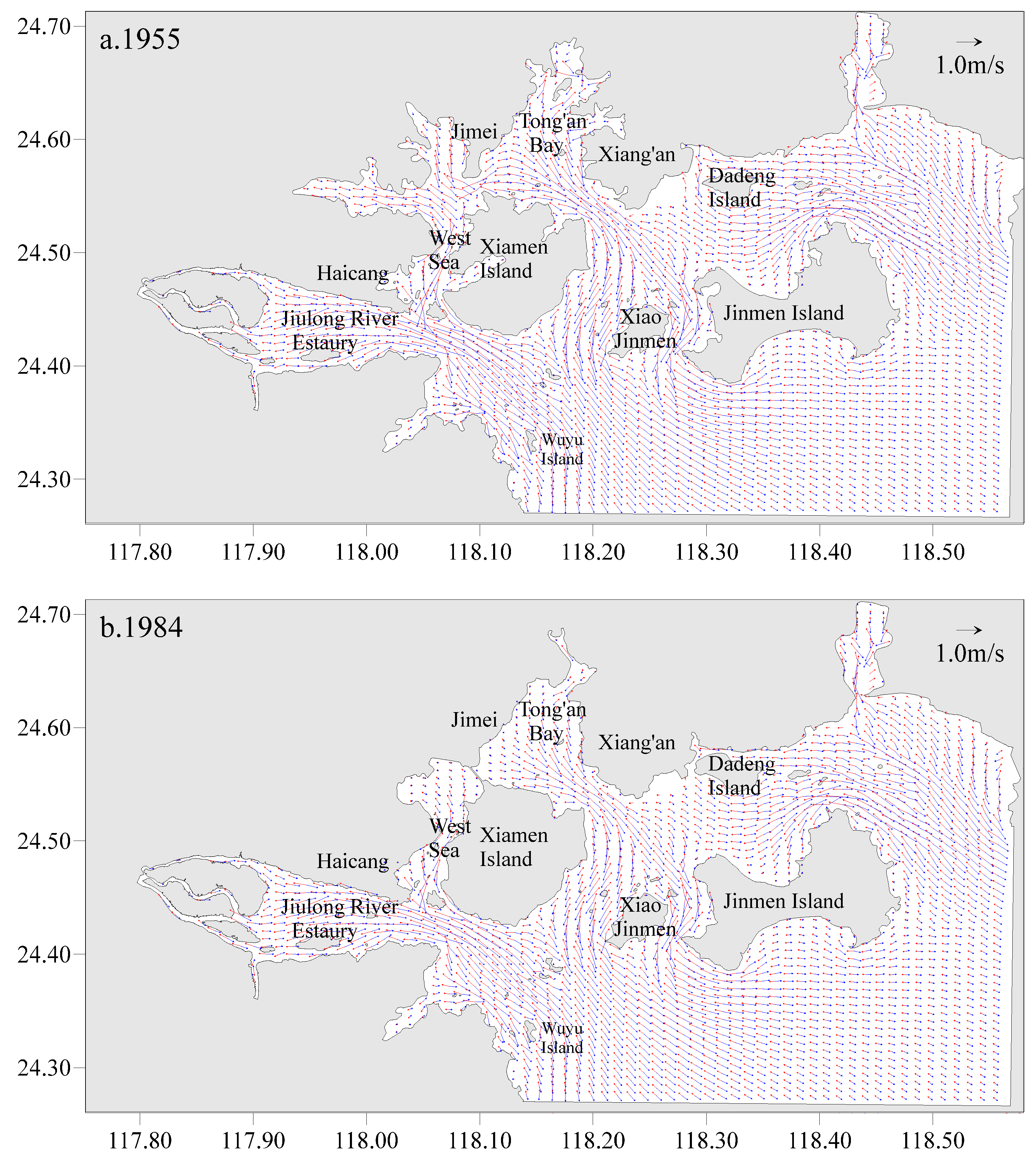 Figure 8 illustrates the flow patterns of tidal current during both flood and ebb tides in typical years (1955, 1984 and 2013). The patterns of tidal currents exhibit similarities across various coastal configurations, with some localized variations attributable to reclamation and levee construction projects. In 1955, the coastline of XMB retained its natural characteristics, with areas such as Xinglin Bay, Maluan Bay, and Dongkeng Bay functioning as open water bodies (