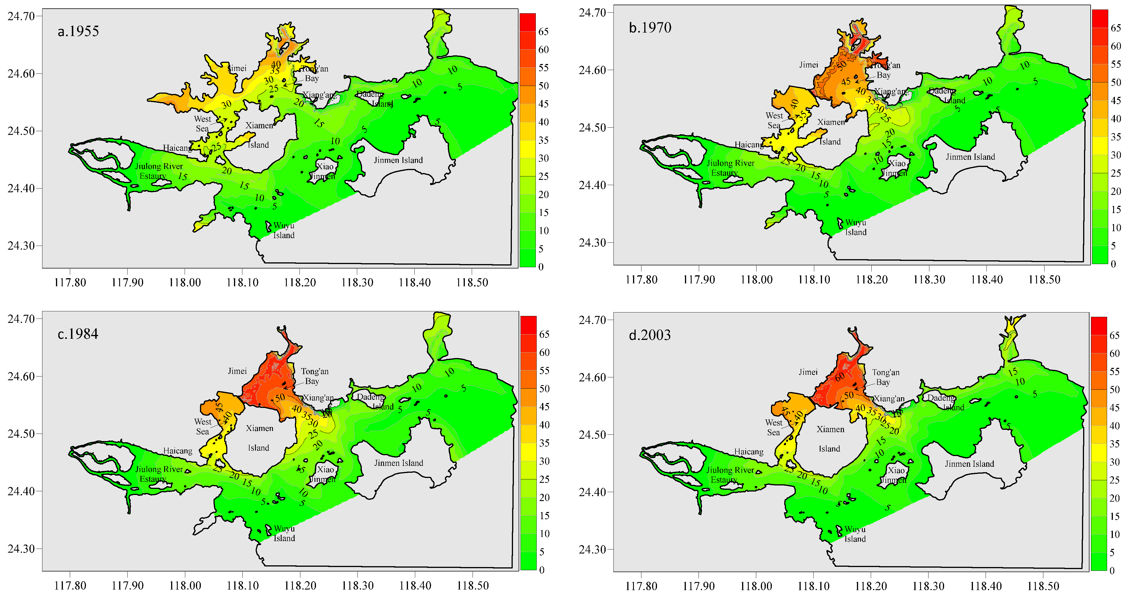 By 1970, the shoreline conditions had changed due to the construction of the Gaoji Dike, Jixing Dike, and Maluan Bay Dike, which disrupted the seawater circulation between the West Sea and Tong’an Bay (