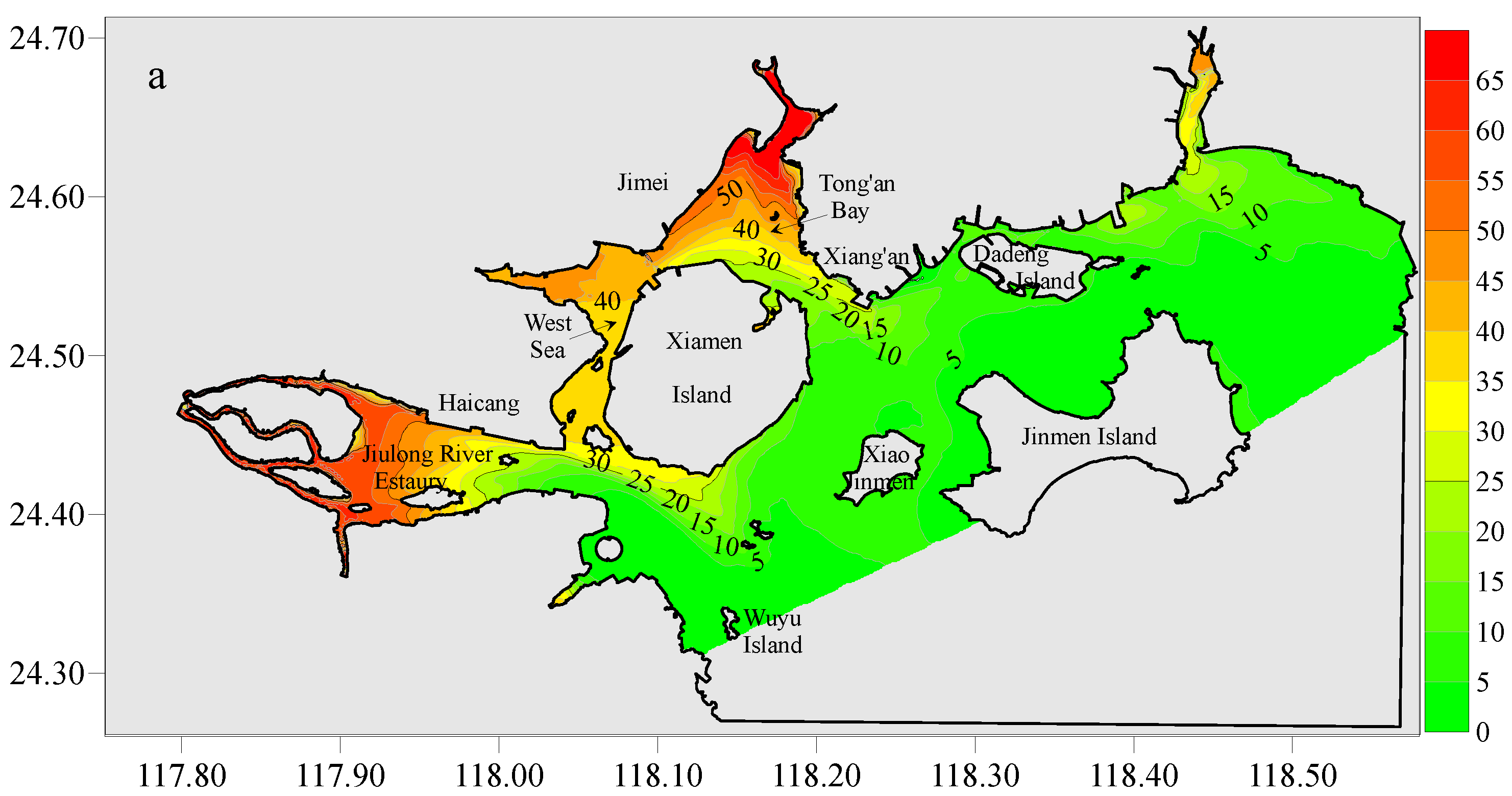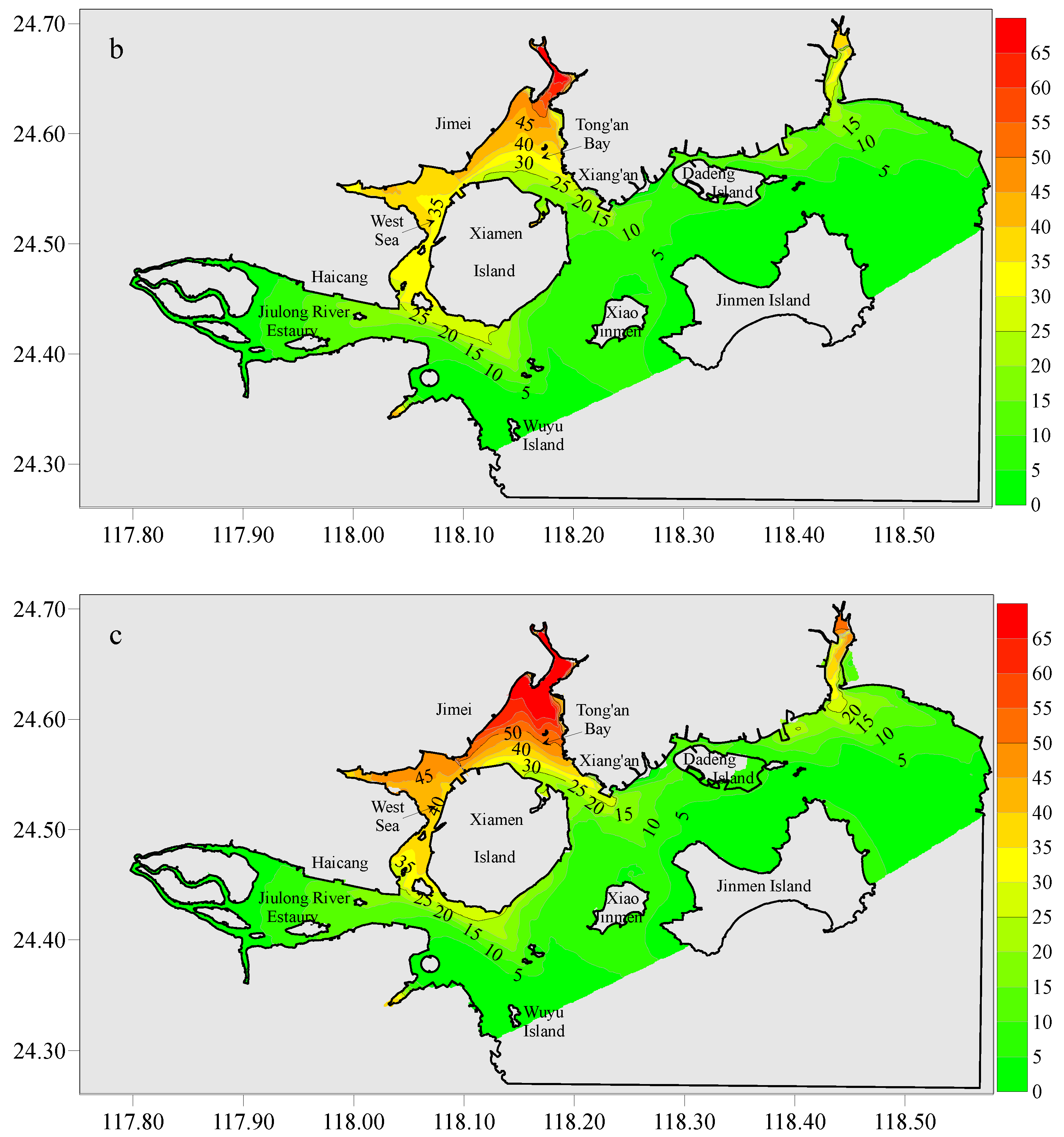 Figure 9a), featuring an expansive water area, significant tidal volume, strong internal connectivity within the bay, vigorous hydrodynamic forces, and a high rate of water exchange between the bay and the adjacent open sea. This dynamic resulted in generally low residence times for water within the bay. In contrast, the regions surrounding Xinglin Bay, Maluan Bay, and the upper sections of Tong’an Bay exhibited relatively extended water residence times, indicating weaker hydrodynamic forces in these areas. This condition led to prolonged water exchange durations, thereby facilitating the accumulation of pollutants. Specifically, the average residence time in the West Sea varied between 20 and 46 days, while in Tong’an Bay, it ranged from 13 to 49 days, and in the Jiulong River estuary, it was between 2 and 24 days. The shortest residence time was recorded in the Dadeng Sea, with a range of 1 to 26 days.