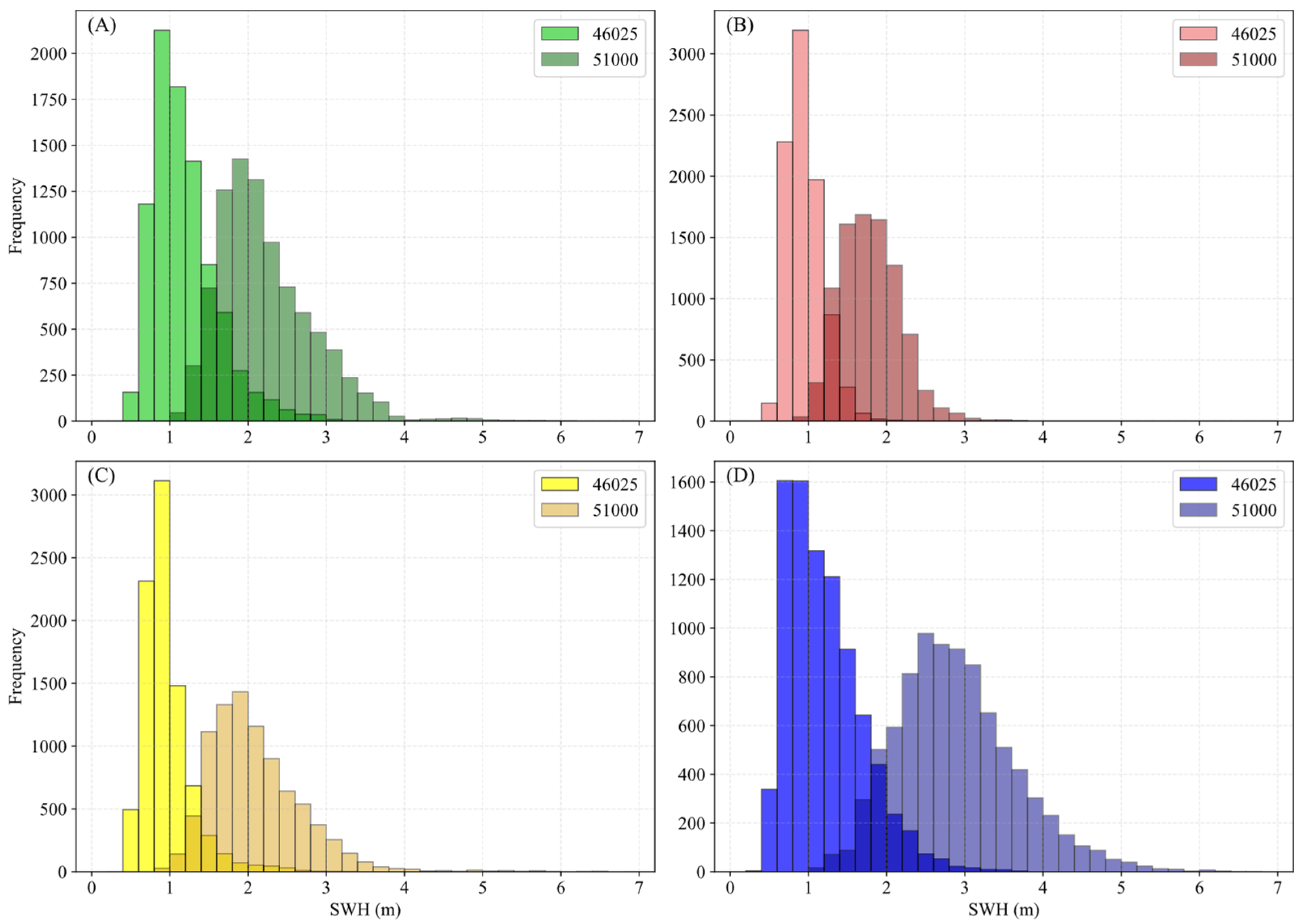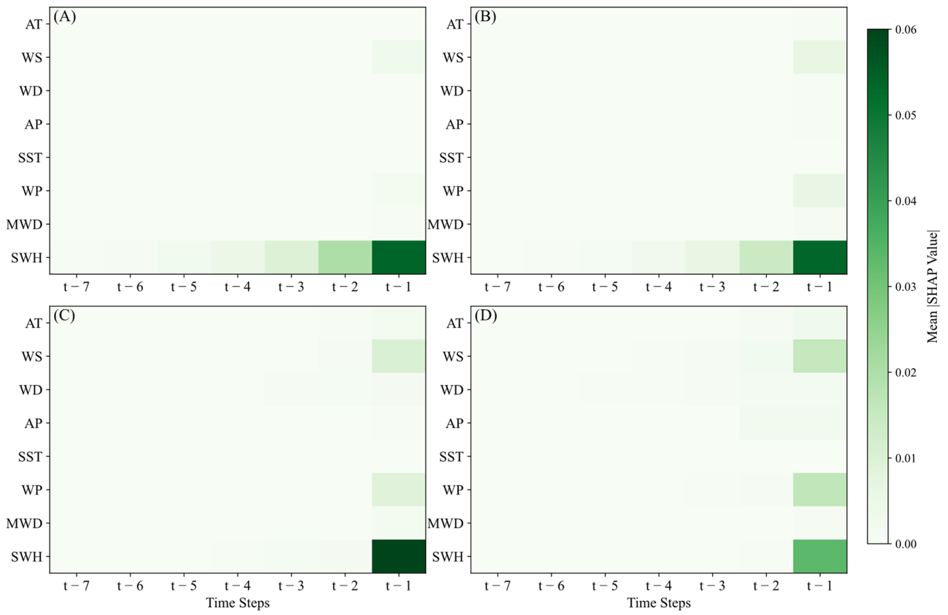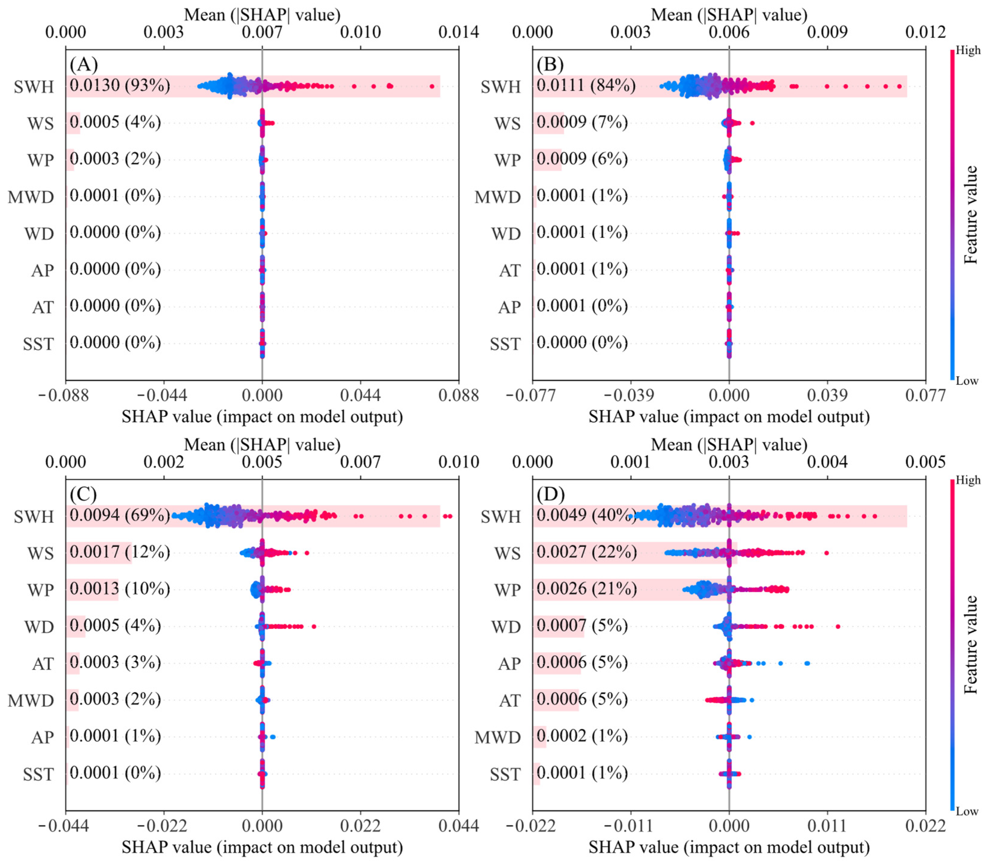 - Finally, through SHAP analysis, it was found that in 1 h SWH forecasts, the contributions of SWH, WS, and WP features are dominant. In 24 h forecasts, historical SWH remains the primary driver, while WS and WP gain significance; only SST and MWD exhibit negligible impacts.