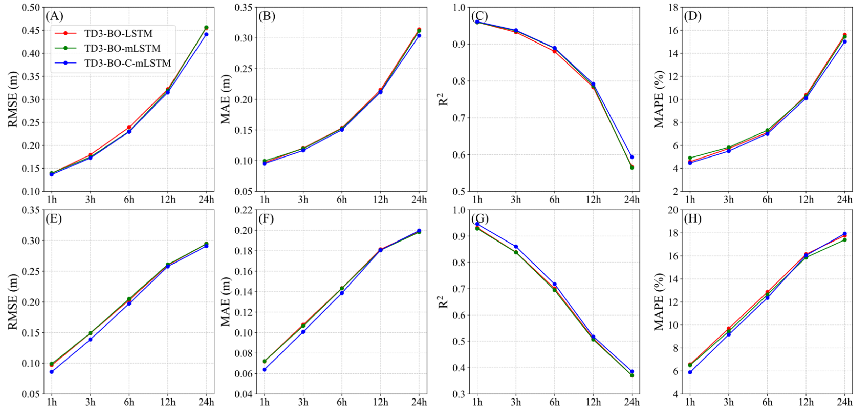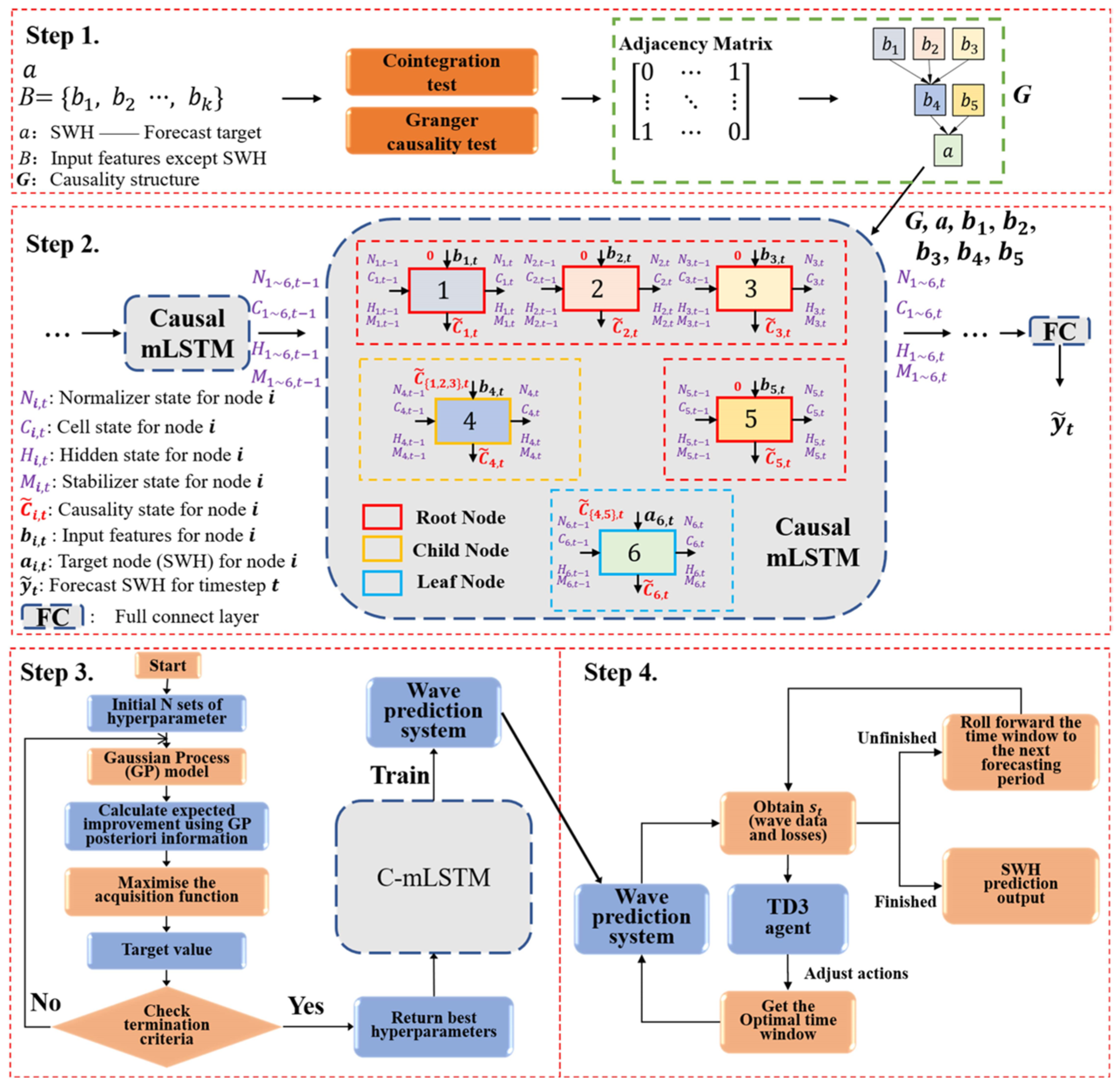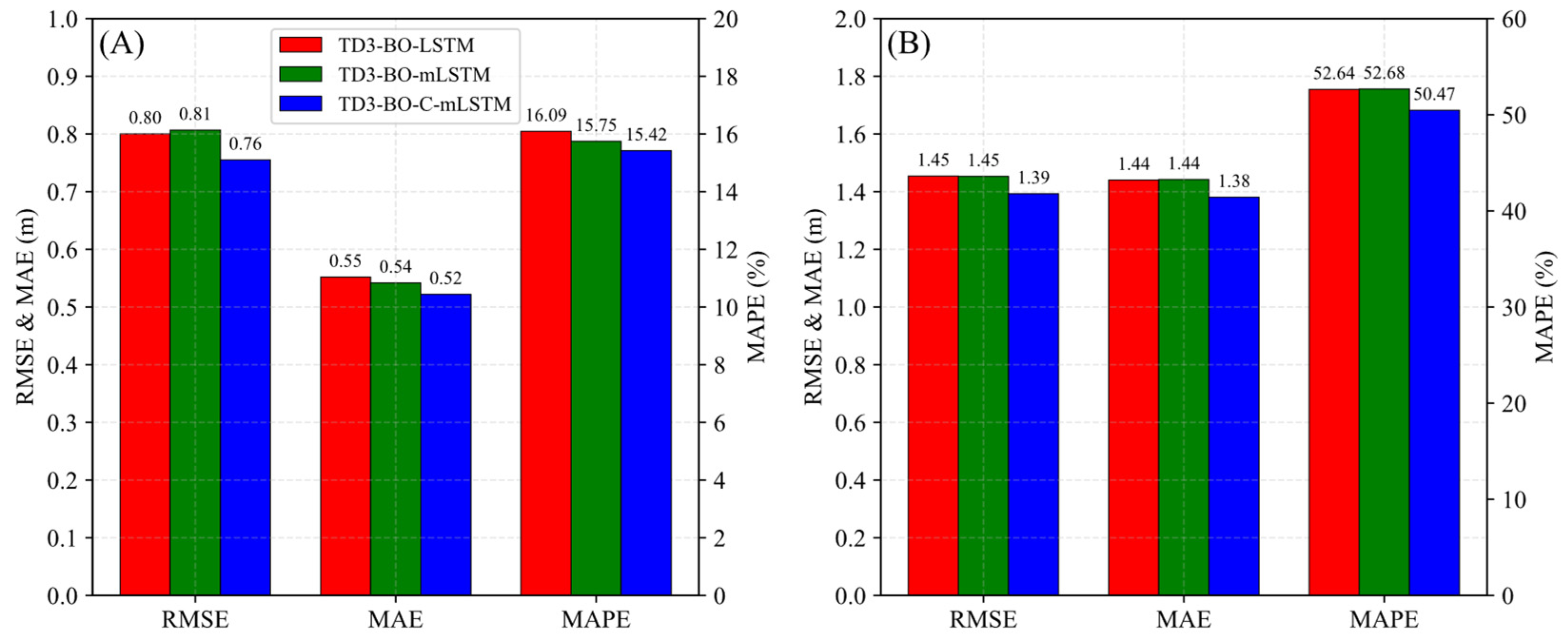 - In terms of model optimization, we incorporated the BO algorithm and the TD3 algorithm. BO improves average SWH prediction accuracy by 16.48% through hyperparameter tuning for all models (LSTM, mLSTM, and C-mLSTM). TD3 dynamically adjusts input window length based on historical data and historical loss values, yielding a further 2.35% accuracy gain. Combined implementation delivers 16.85% overall performance improvement.