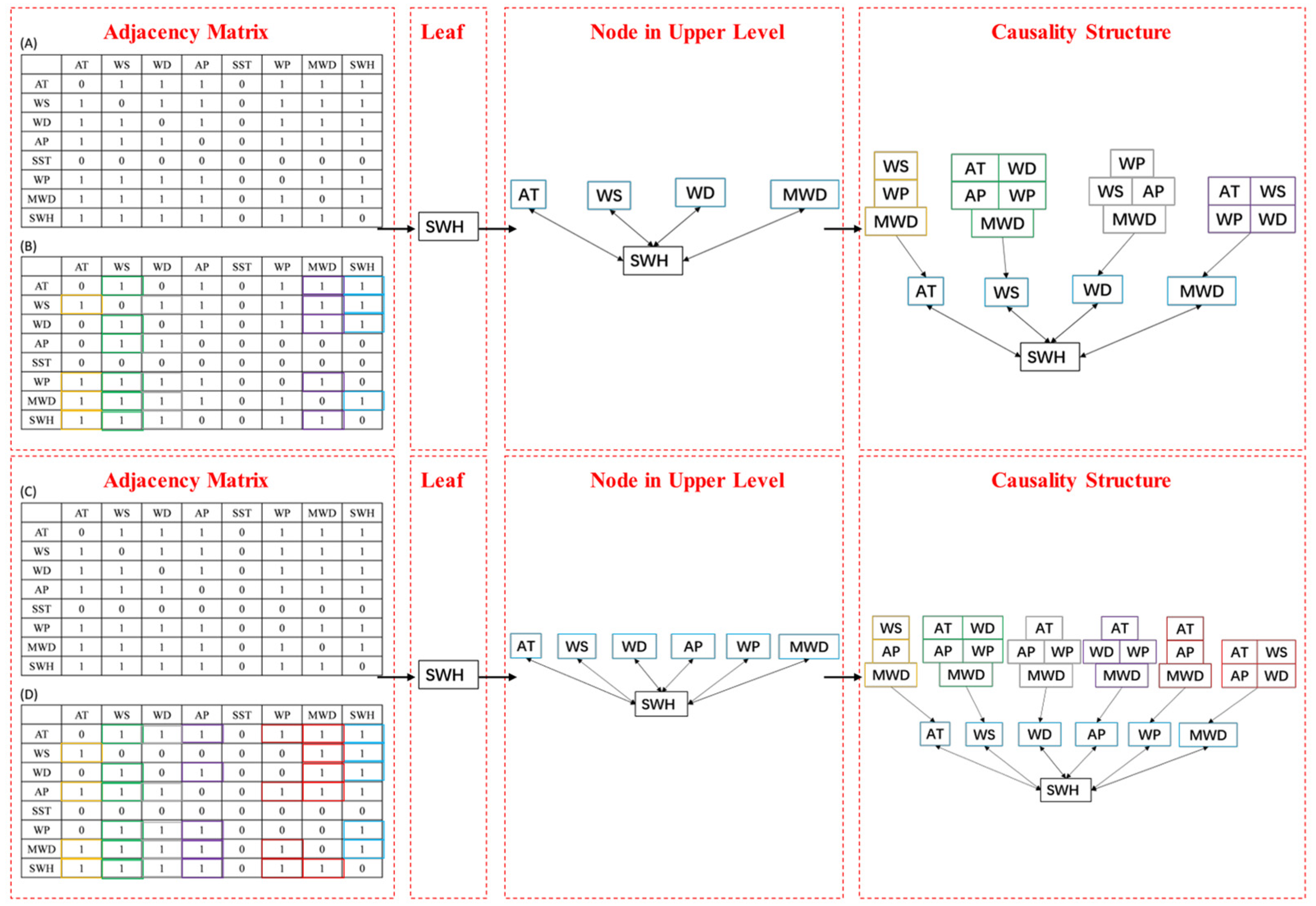 - Transform the adjacency matrix into the long-term causal relationship dataset (Figure 4). The conversion involves four steps (using Station 51000 as an example): First, set prediction target SWH as the leaf node. Additionally, assign SWH’s causal drivers (AT, WS, WD, and MWD, indicated by the blue boxes) as parent nodes of the leaf. What is more, for variables in the blue boxes, repeat the previous step to identify their causal drivers and assign them as parent nodes. Finally, starting from the root node, compile each variable’s index, parent count, and parent indices into the dataset.