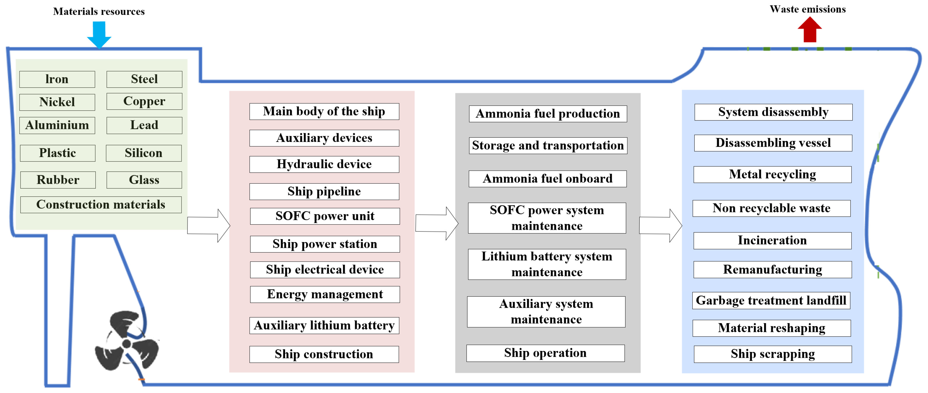 - Lifecycle phase assumptions: This study divides the ship’s lifecycle into three primary stages—construction, operation, and decommissioning—assuming a total service life of 25 years. The ship is modeled to operate for approximately 300 days per year, with a daily ammonia consumption rate estimated at 7.2 tons during sailing and 1.1 tons while docked. These assumptions provide a conservative estimate for the operational phase but may differ for ships with varying service durations or utilization patterns.
