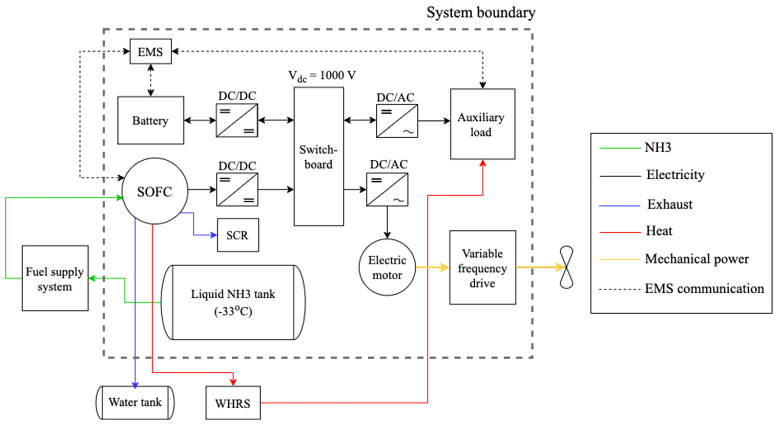 - Data availability and estimations: due to the nascent nature of ammonia-fueled SOFC systems in marine applications, empirical data on full-scale, operational ammonia-powered ships are limited. Consequently, certain parameters, such as emissions, fuel consumption, and energy efficiency, were estimated based on scaled data from prototype systems, laboratory studies, and analogous technologies. While every effort was made to align these estimates with realistic values, the absence of extensive operational data introduces some uncertainty, particularly regarding long-term performance and wear factors.