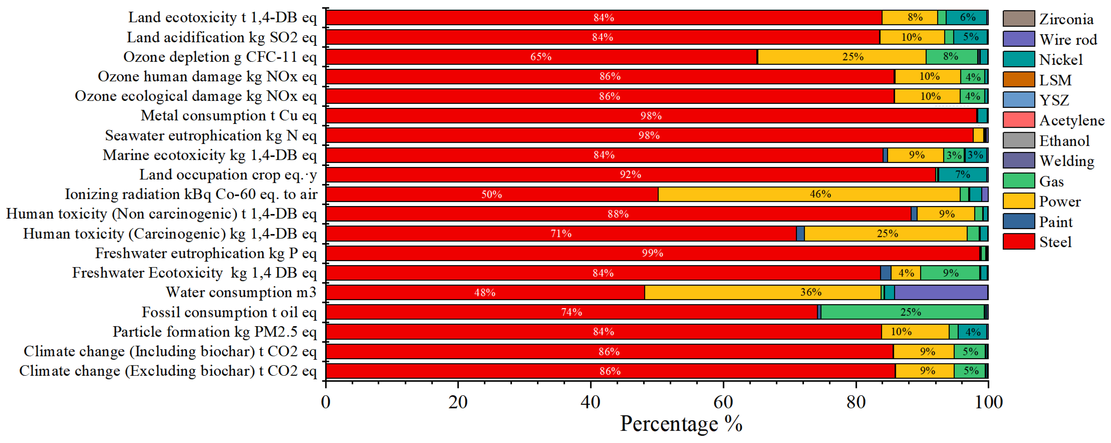 - The specific environmental impacts of different material inputs were analyzed in detail across the three core stages of construction, operation, and Decommissioning. The life cycle impact analysis results of the material inputs in each stage of ammonia-fueled ships indicate that the environmental load during the construction phase is mainly due to the use of steel and electricity. During the operation phase, the use and related emissions of ammonia fuel have a particularly significant environmental impact. In the dismantling/recycling phase, the environmental impacts of electricity and industrial gases are comparable.