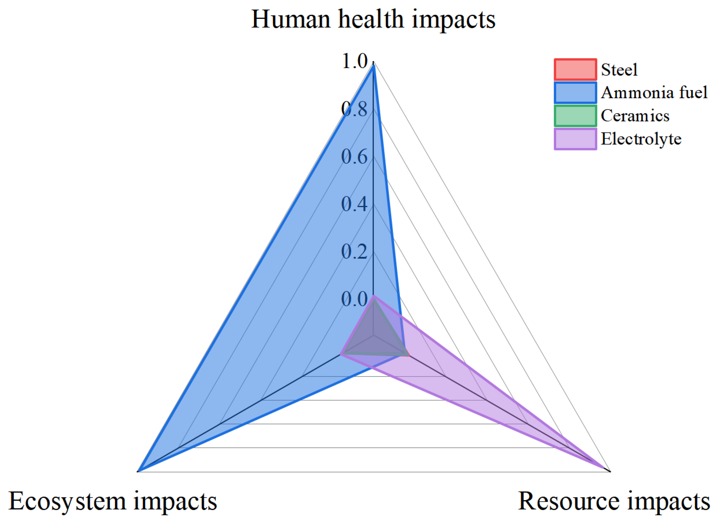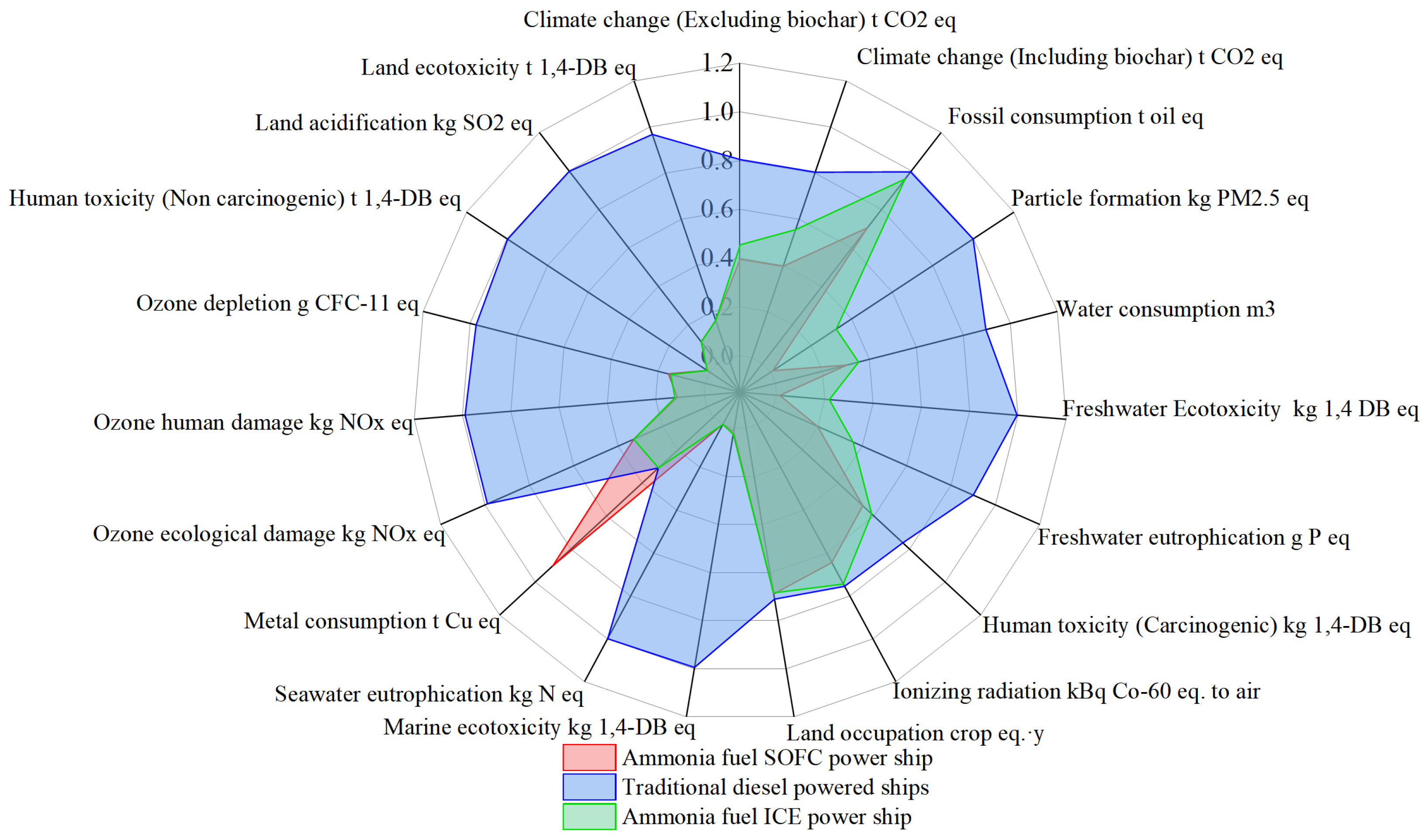 - To reduce the environmental impacts during the construction phase, strategies such as optimized material selection, the use of recycled materials, and the adoption of energy-efficient manufacturing technologies are essential. Green shipyard practices, including the integration of renewable energy sources, can further lower emissions. For the operation phase, transitioning to green ammonia, enhancing SOFC fuel efficiency, and integrating waste heat recovery systems offer significant potential for mitigating environmental loads. Advanced energy management systems can further optimize fuel use and power distribution. These strategies provide a pathway for improving the environmental performance of ammonia-fueled SOFC-powered ships, contributing to the broader goals of sustainable maritime transport.
