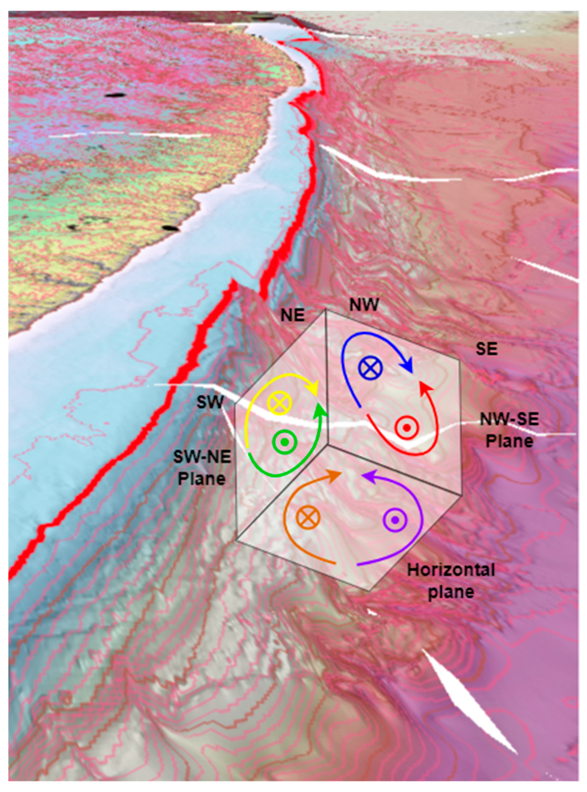 75]. Currents like the Agulhas that flow along a submarine surface experience a frictional boundary layer (shear) along the slope, which can be expected to result in the formation of cylindrical vortices of considerable depth, with axis of spin parallel to the slope gradient (pointing downwards towards the SE). These are represented in