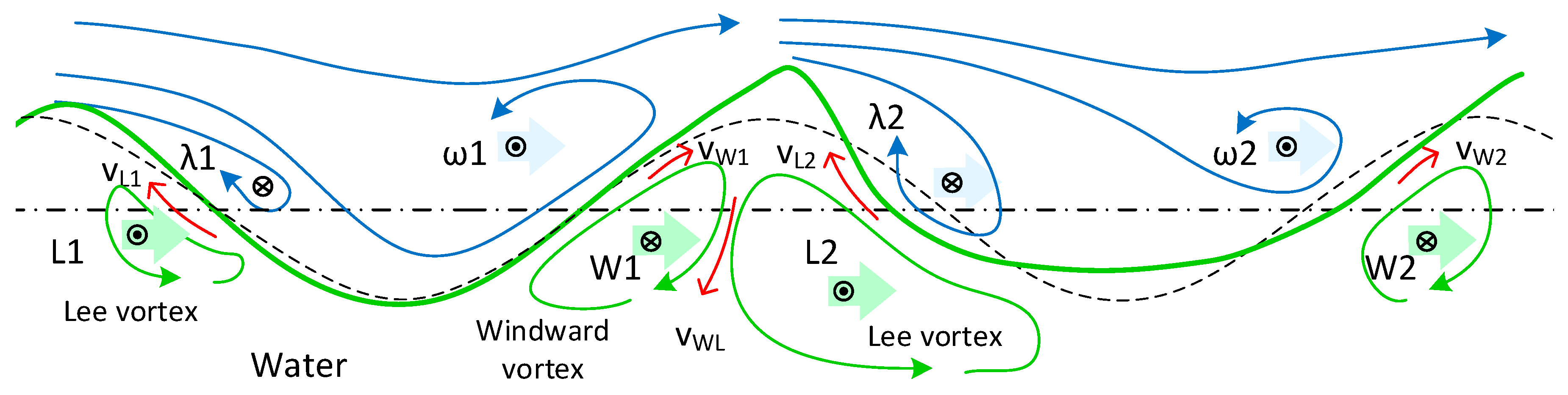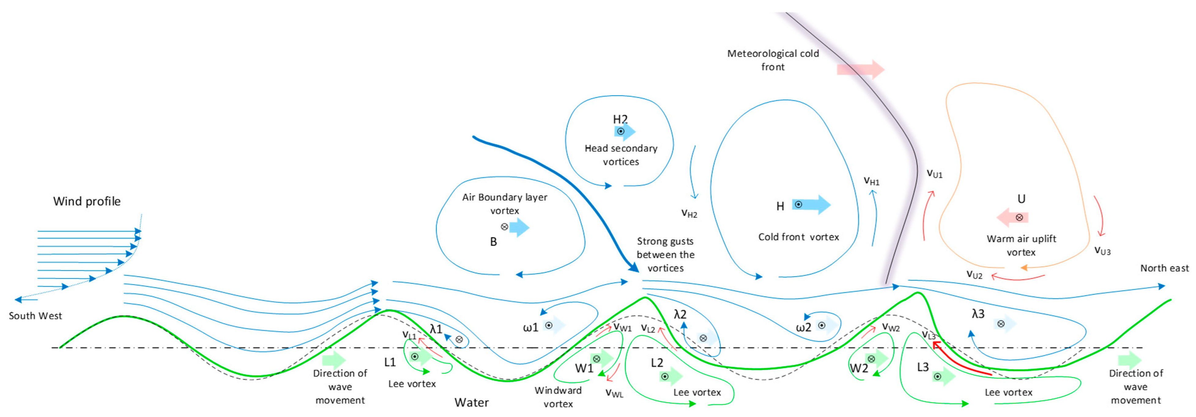 Wave sharpening and heightening occurs by wind lee vortices. The air vortices arise from flow separation off the crest of the wave under high wind conditions. They are reinforced by vortices in the meteorological cold front, particularly the air boundary layer vortices. Thus, the SW winds of a cold weather front create a wind lee vortex λ, itself strengthened by air jetting from the weather H/H2 and B vortices.