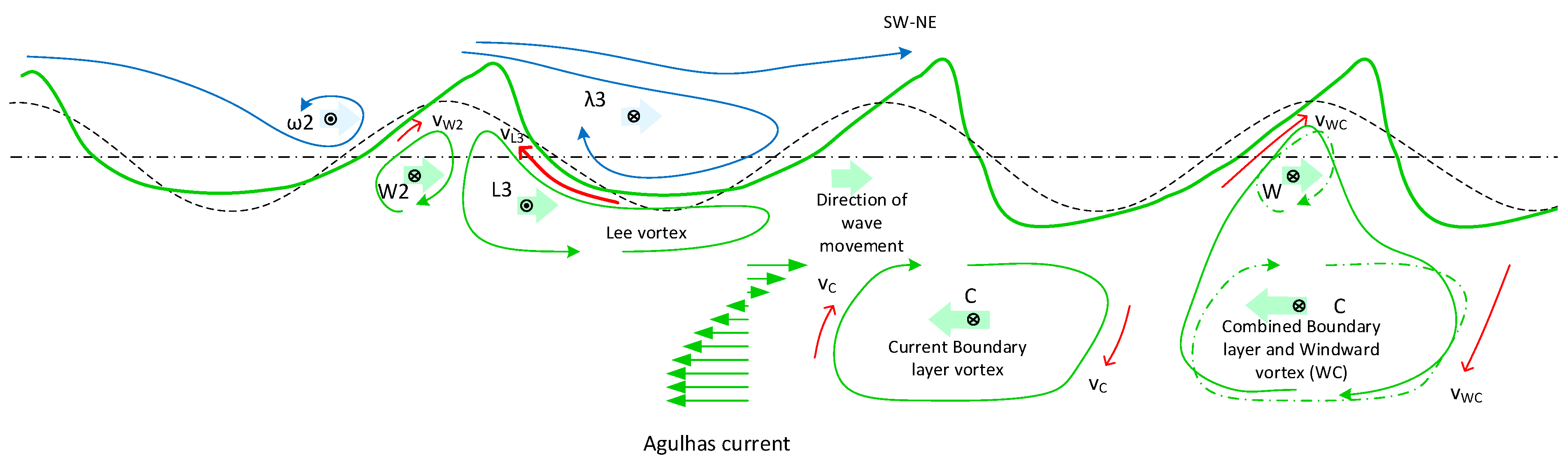 48] and additional mechanisms are necessary to develop the rogue wave characteristics of height, steepness, non-breaking, asymmetrical form, and a preceding trough. This is attributed to several vortex interactions. Wind lee vortices cause wave steepening, especially on the leeward face of the wave. This suppresses wave breaking. The vortices depend on the wind speeds, hence also on the strength of the meteorological cold front. Air boundary layer vortices from the meteorological cold front transfer energy to the wind lee vortices thereby enhancing their wave-sharpening effect. Agulhas current boundary layer vortices (at the water–air surface) interact with water lee vortices to accelerate a jet of water between them, thereby steepening the wave forward by removing water from the foot of the wave, and also enhancing the preceding trough. Bathymetric topology, especially a canyon on the shelf break (continental slope), generates a vortex in the flow of the Agulhas current. The upper end of this rope-like vortex is detached from the canyon by prising of the coastal downwelling current (induced by the meteorological cold front). The vortex moves upwards and combines with the water lee vortex to drive heightening of the wave and scavenging of the preceding trough. Jetting arises when the canyon vortex and the Agulhas current boundary layer vortices pass each other, thereby accentuating wave height, steepness, and asymmetry. In addition, slope vortices arise from frictional movement of the Agulhas current along the continental slope, which reinforce the canyon vortices.