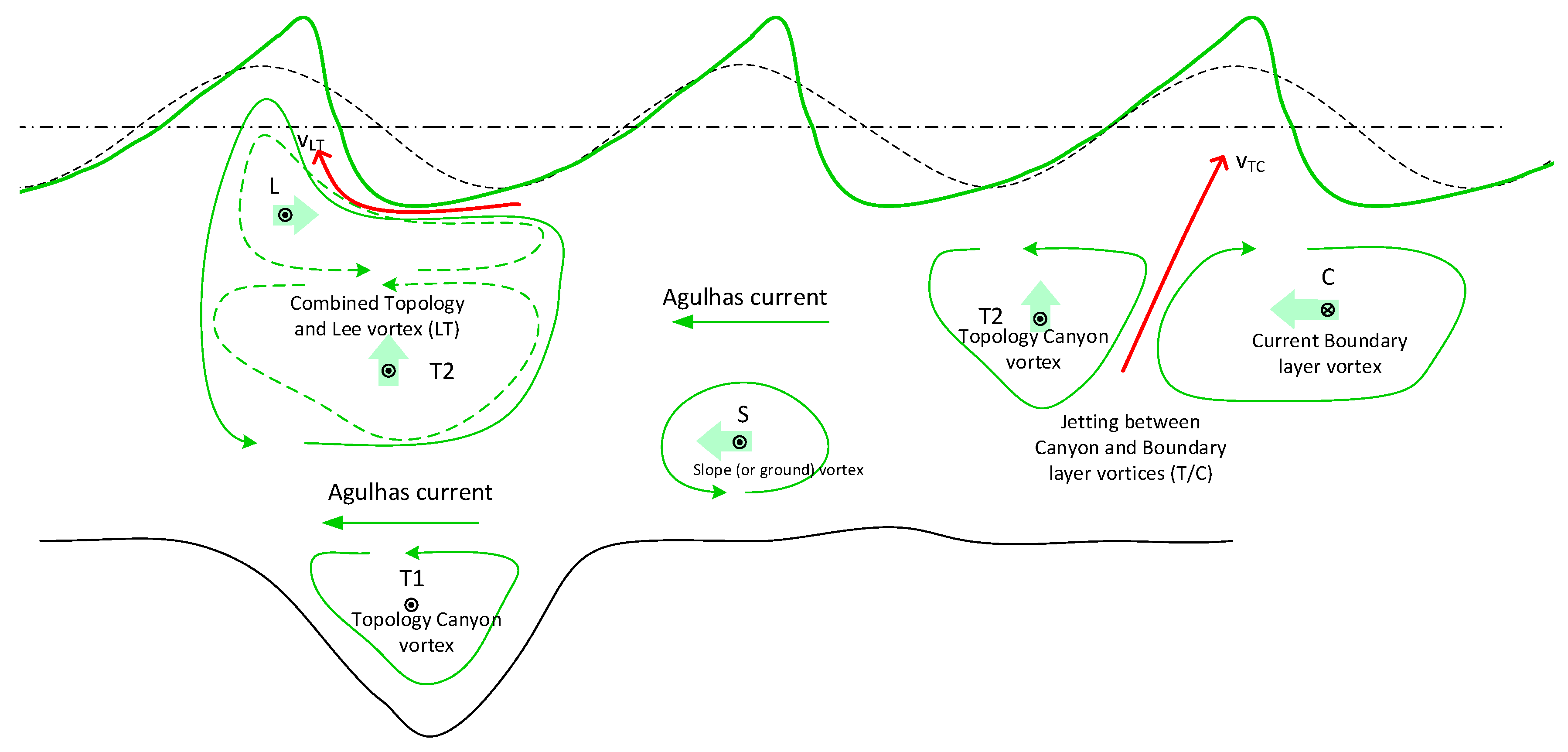 The vortices are at very different length scales. The lee vortices (wind and wave) are of similar size to the wave (20 m), the Agulhas boundary layer vortices perhaps the same, the upwelling–downwelling vortices are geometrically constrained to the depth of the continental shelf (200 m), and the canyon vortices limited to the cross section of the canyon (2 km). The larger vortices can be expected to form a smaller one, per the Kolmogorov breakdown route. Hence, it is feasible to conceive of large vortex structures such as the canyon vortex, developing smaller vortices at the 20 m scale that can interact with the lee vortex in the wave. The result is chaotic interactions, within which wave superposition arises. There is complex timing for all these vortices to interact, which is consistent with the rogue wave presenting as an occasional rather than regular process.