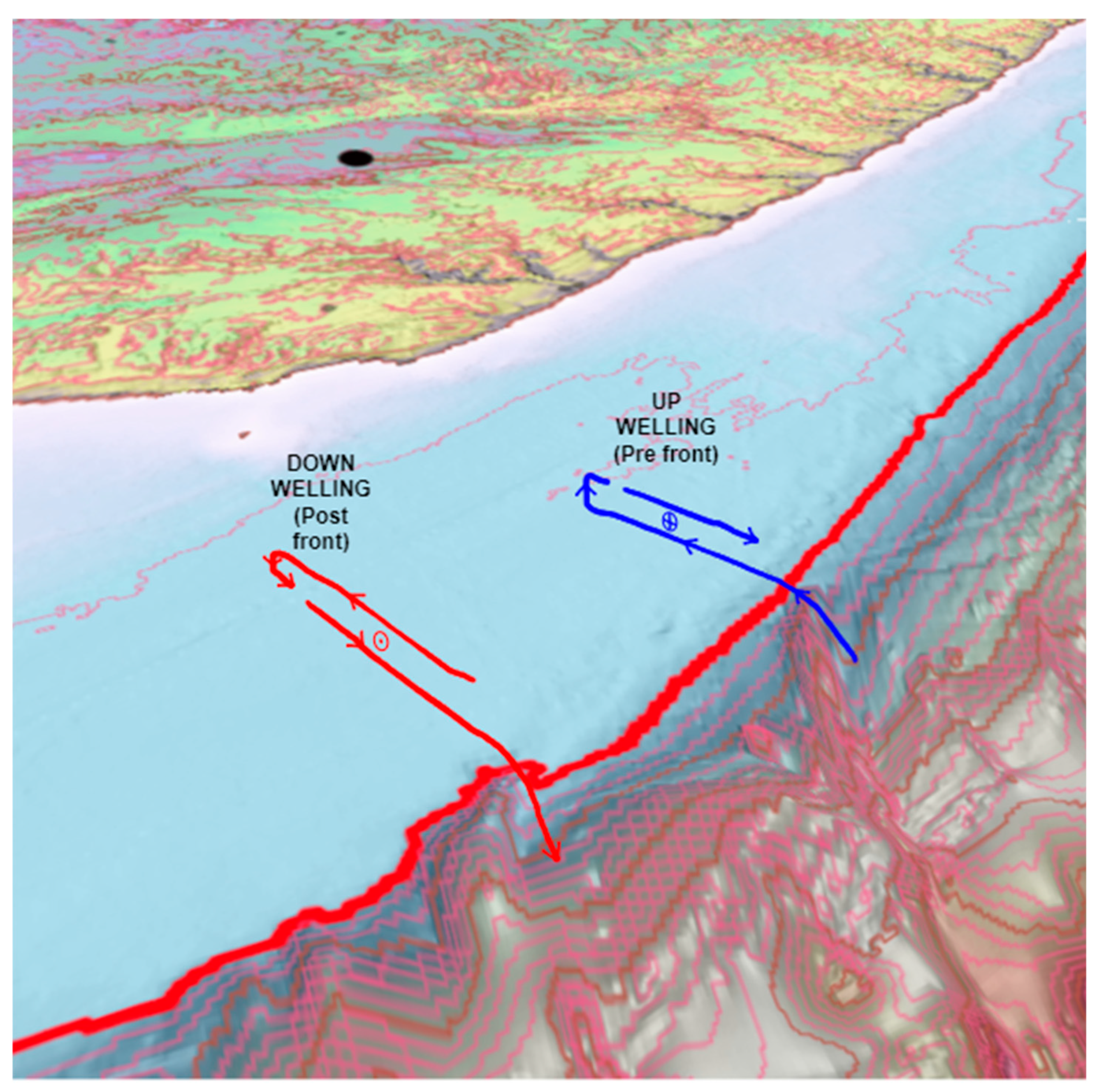 The canyon upwelling literature are decoupled from meteorological effects such as cold front weather systems—the fronts mentioned in the upwelling papers are exclusively fronts between warm and cold bodies of water, not air. Nonetheless, the connection may be made with reasonable confidence. For the South African east coast, a weather cold front is preceded by W, NW, and NE winds [