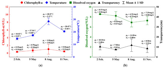 Because biofouling is often influenced by oceanographic variability, a statistical analysis was conducted on four parameters widely recognized as relevant to fouling processes—temperature, dissolved oxygen, chlorophyll-a, and transparency. These parameters are particularly relevant to fouling dynamics, as temperature regulates metabolic activity and settlement rates of fouling organisms; dissolved oxygen determines respiration and survival; chlorophyll-a serves as a proxy for phytoplankton biomass that supports higher trophic colonizers; and transparency reflects light availability critical for algal and biofilm growth. The three-year mean values of these variables were 20.7 °C, 7.7 mg/L, 0.54 µg/L, and 9.0 m, respectively, and all parameters exhibited the largest standard deviations in August (Figure 2).
