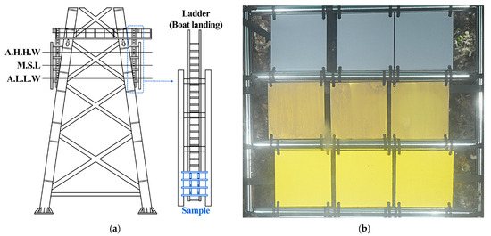 Installation of coating samples at the offshore wind turbine substructure: (a) Schematic diagram showing the stainless steel pipe frame attached to the bottom section of the boat-landing ladder, below the Approximate Lowest Low Water (ALLW) level; (b) Photographs of PVC plates (10 × 10 cm) coated with different systems and mounted on the frame immediately after installation (0 month).