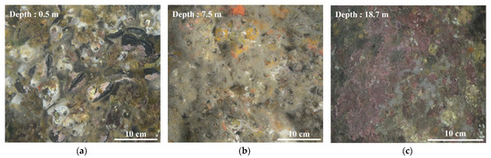 Depth-related composition of fouling communities at the research site: (a) Mussels and barnacles at 0.5 m; (b) Barnacles and sea anemones at 7.5 m; (c) Coralline algae near the seabed at 18.7 m.