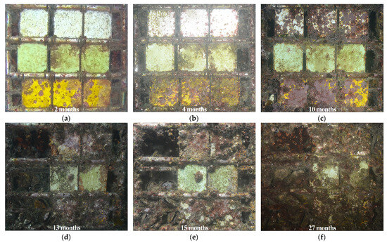 Time-lapse monitoring images of coating samples over the 27 months exposure period: (a) 2 months; (b) 4 months: (c) 10 months; (d) 13 months; (e) 15 months; (f) 27 months. For comparison with the pre-exposure condition of the samples, see Figure 3b.