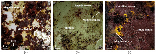 Panels retrieved after 10 months for taxonomic identification of fouling organisms: (a) SPC-A (sample #01); (b) SPC-B (sample #02); (c) Non-antifouling (sample #03). Representative assemblages included barnacles (Megabalanus), bryozoans, coralline algae (Lithophyllum, Corallina), polychaetes (Serpula), chlorophyta (Ulva), and biofilm-forming microorganisms.